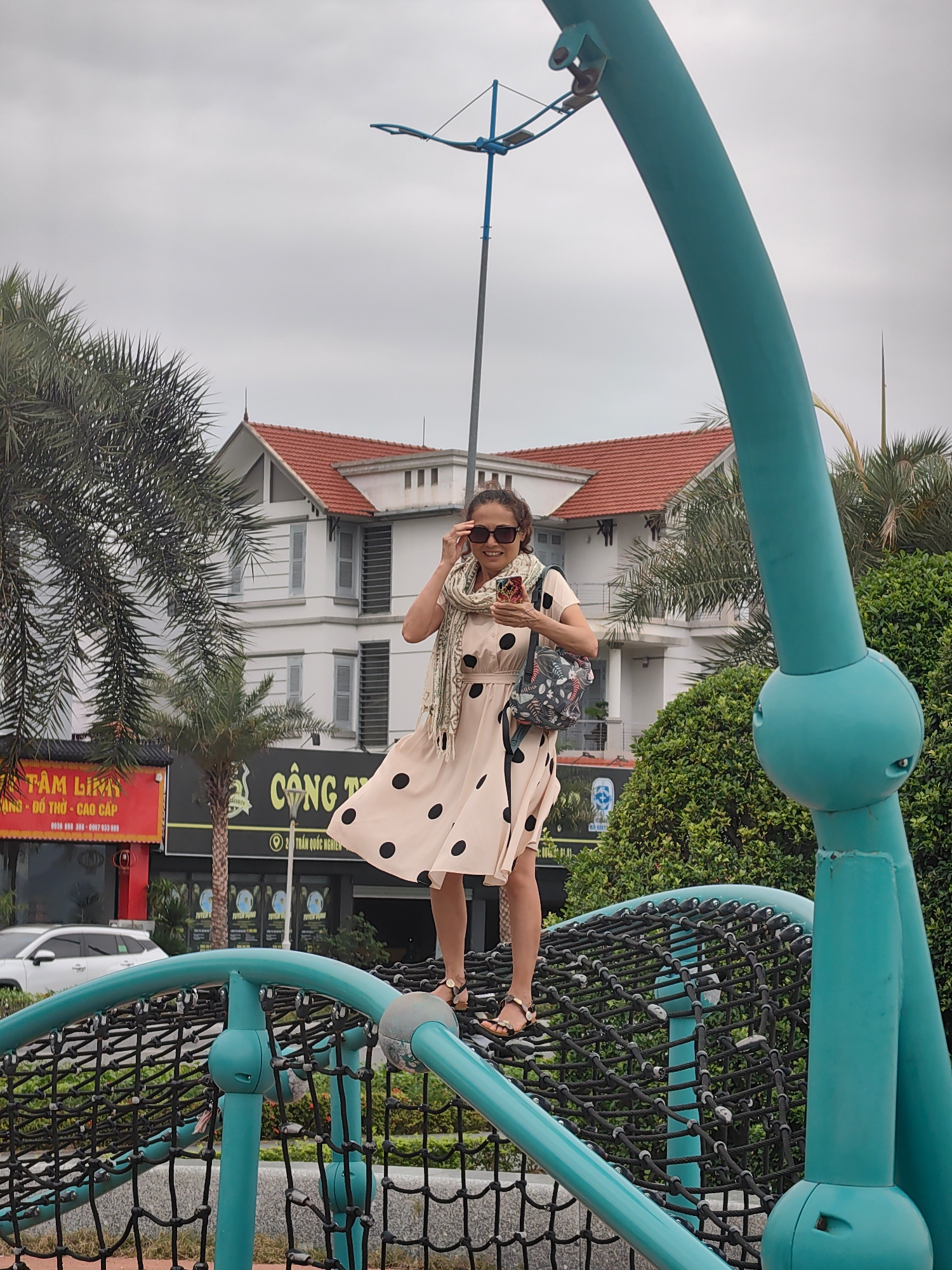 A woman with fair skin is the central figure in this image, standing on a playground climbing structure, seemingly in Ha Long Ward, Vietnam. She wears a light pink dress with black polka dots and a sc…read more