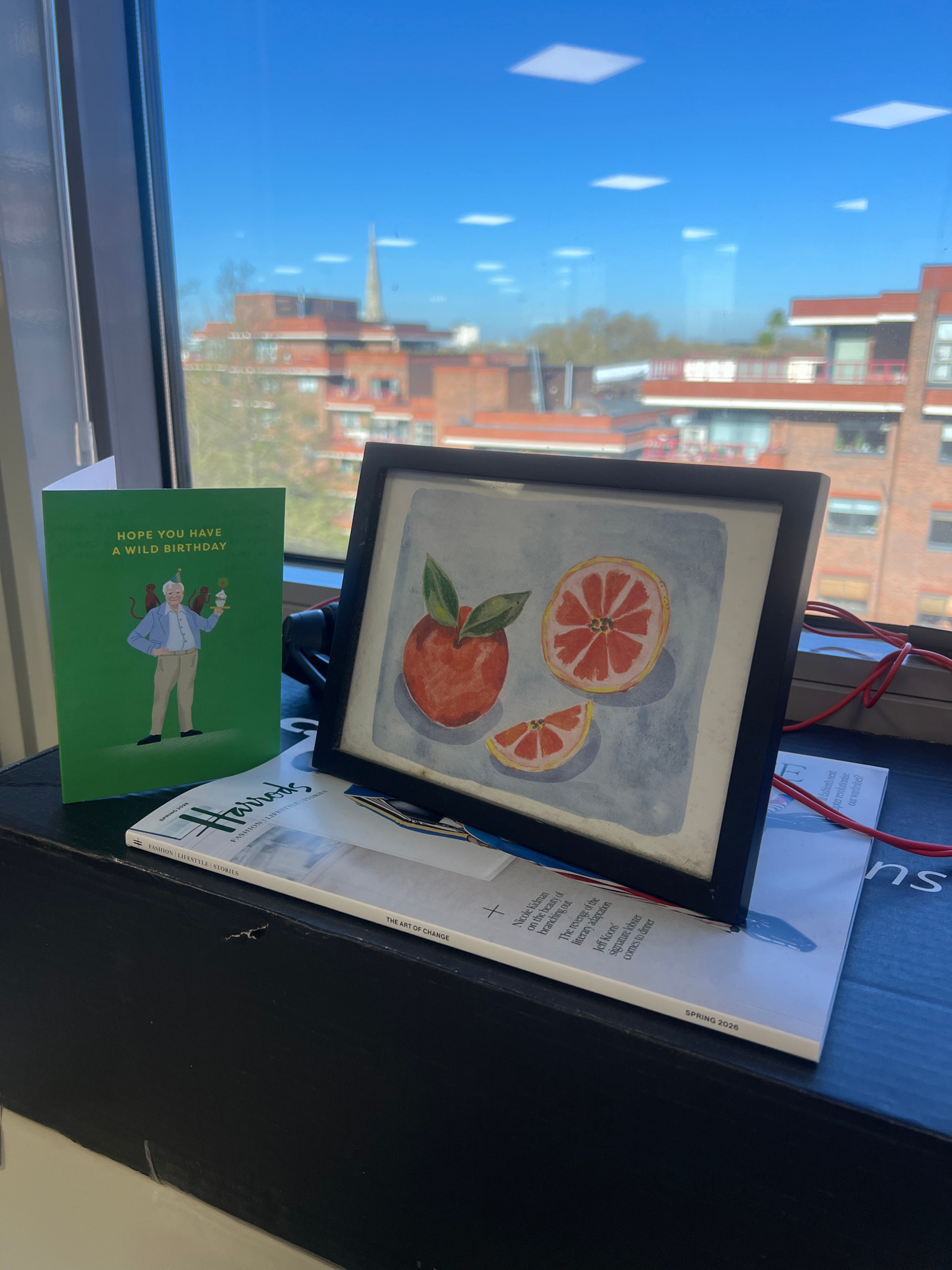 The image depicts a scene on a shelf in what appears to be a room with a window overlooking a cityscape. The foreground features a black framed painting of citrus fruit (orange and grapefruit), a Harr…read more