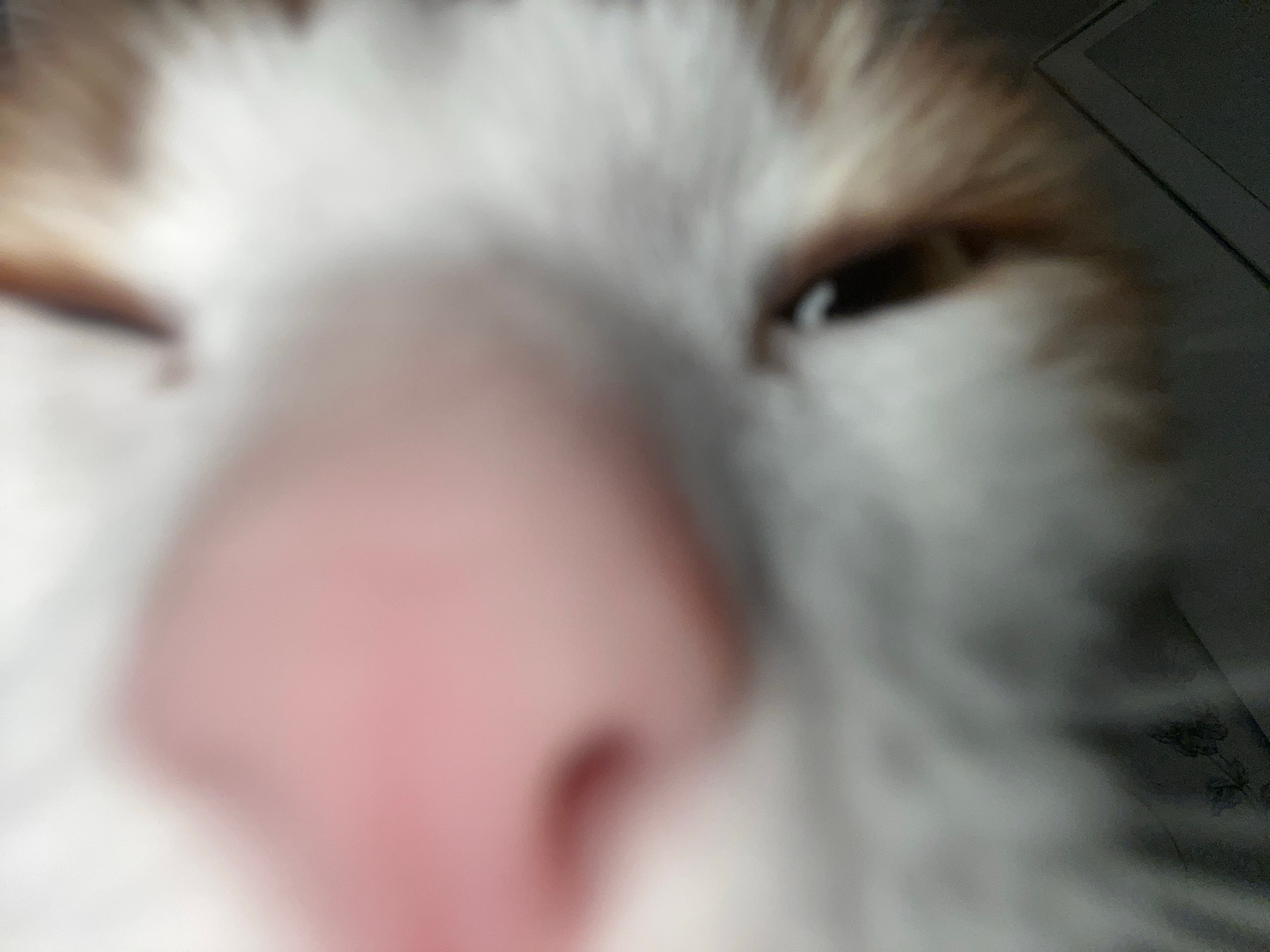 The image shows a close-up, blurry view of a cat's face. The cat's nose is prominently featured and out of focus. One of its eyes is partially visible. The cat has white fur with some brown or ginger…read more