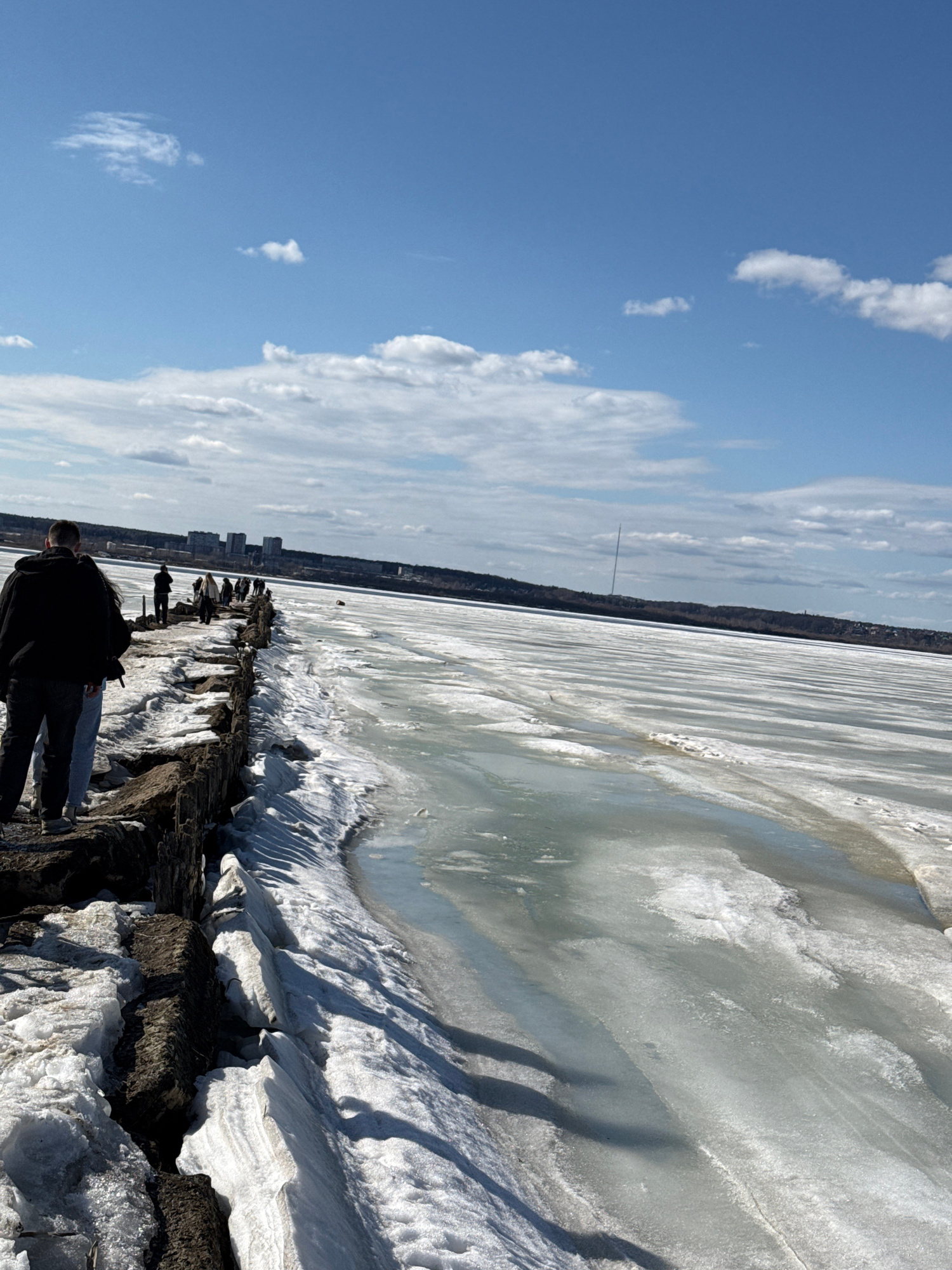 The image depicts a partially frozen body of water, likely a lake or river, on a sunny day with a blue sky and scattered clouds. Along the shoreline, there is a person standing on a rocky or wooden st…read more