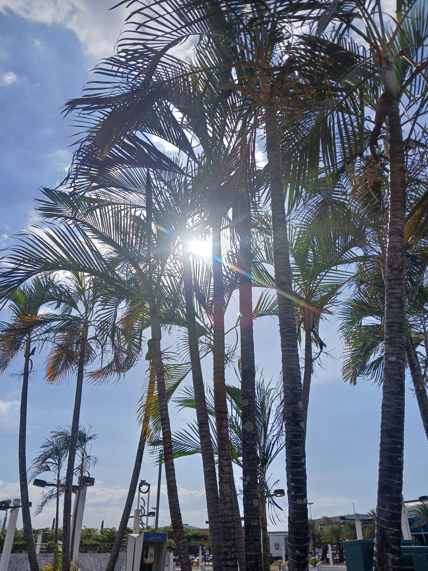 The image shows a view looking up through palm trees towards a blue sky with some clouds. The sun is shining through the leaves, creating a bright glare and lens flare effect. The trunks of the palm t…read more