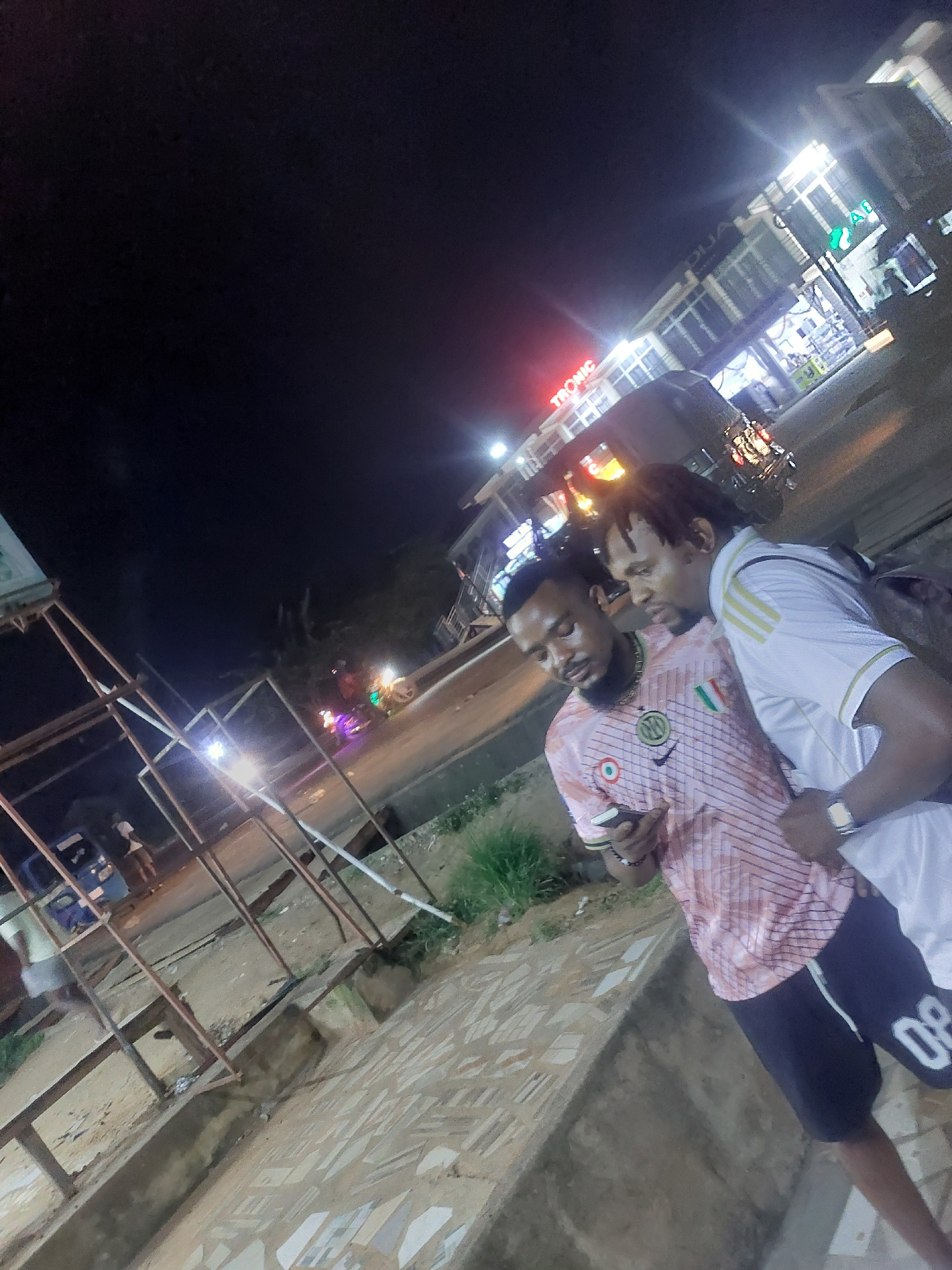 Two men are visible in the image. One wears a white shirt with gold stripes on the shoulder and dark shorts with a white "80" printed on the leg. The other man wears a pink striped shirt and is seen w…read more