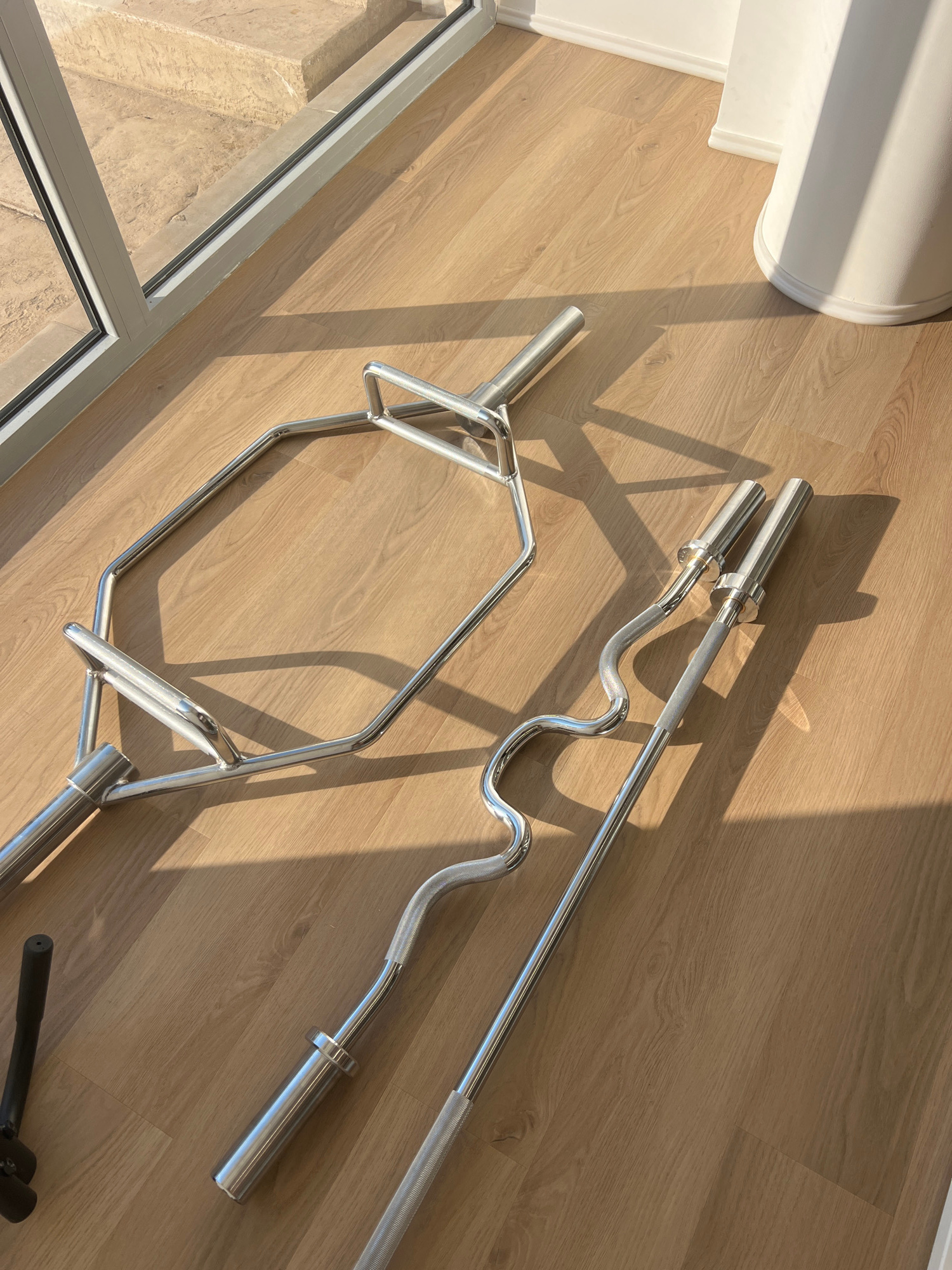 The image shows a light-filled room with a wood-patterned floor, likely indoors given the presence of baseboards and a window/door frame. Three types of weightlifting barbells are on the floor: a trap…read more