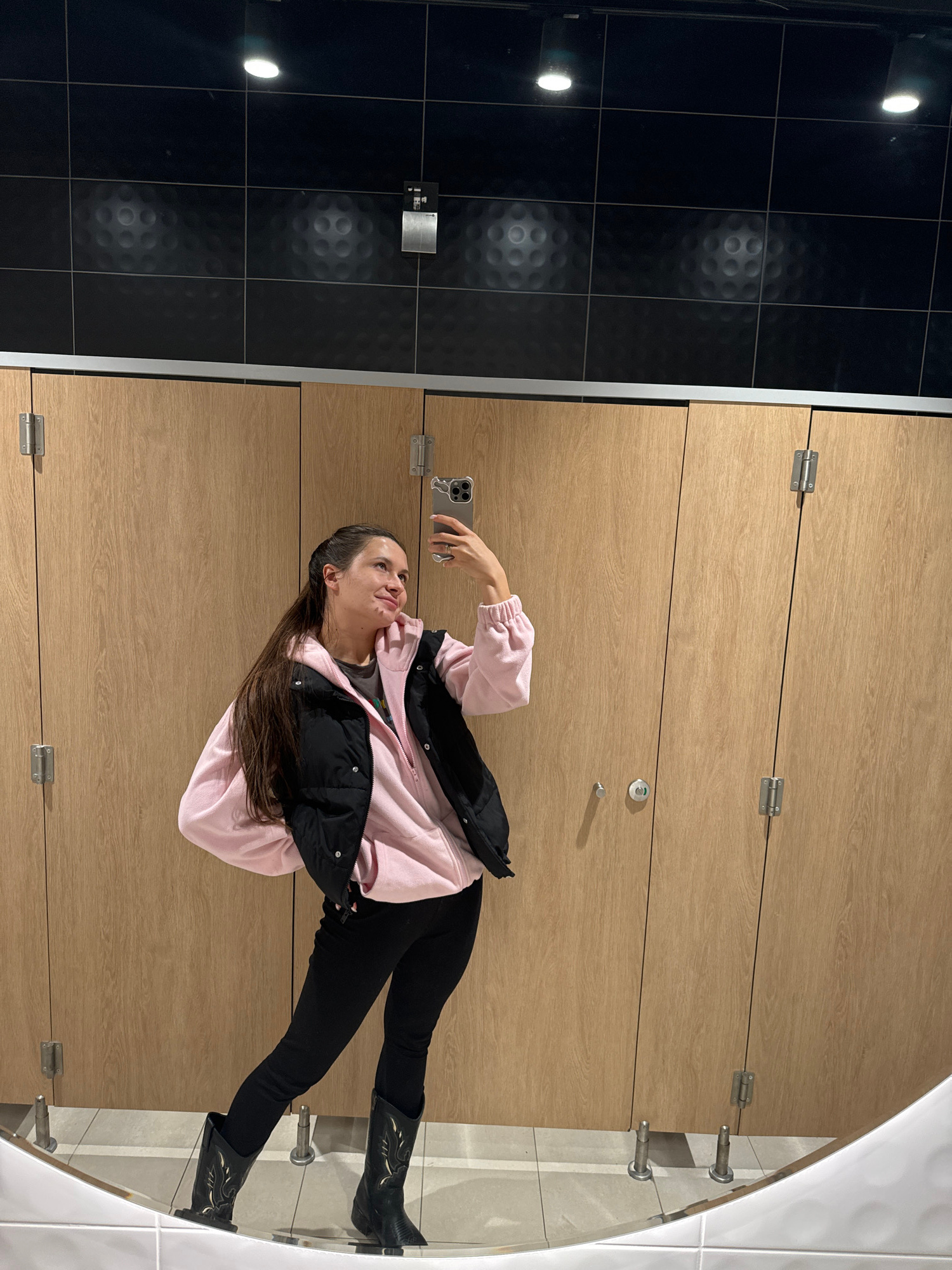 A woman is taking a selfie in a restroom. She is wearing black pants and cowboy boots, a pink hooded sweatshirt, and a black puffer vest. The restroom has light-colored wooden stall doors, black tiled…read more