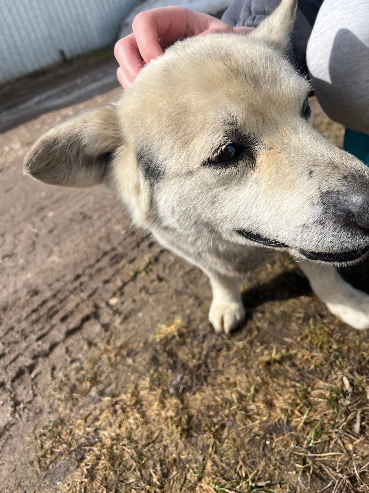 A close-up, high-angle shot shows a light-colored dog with dark markings on its face. A hand is seen touching the dog's head. The ground in the background is a mix of dirt and dead grass. The location…read more