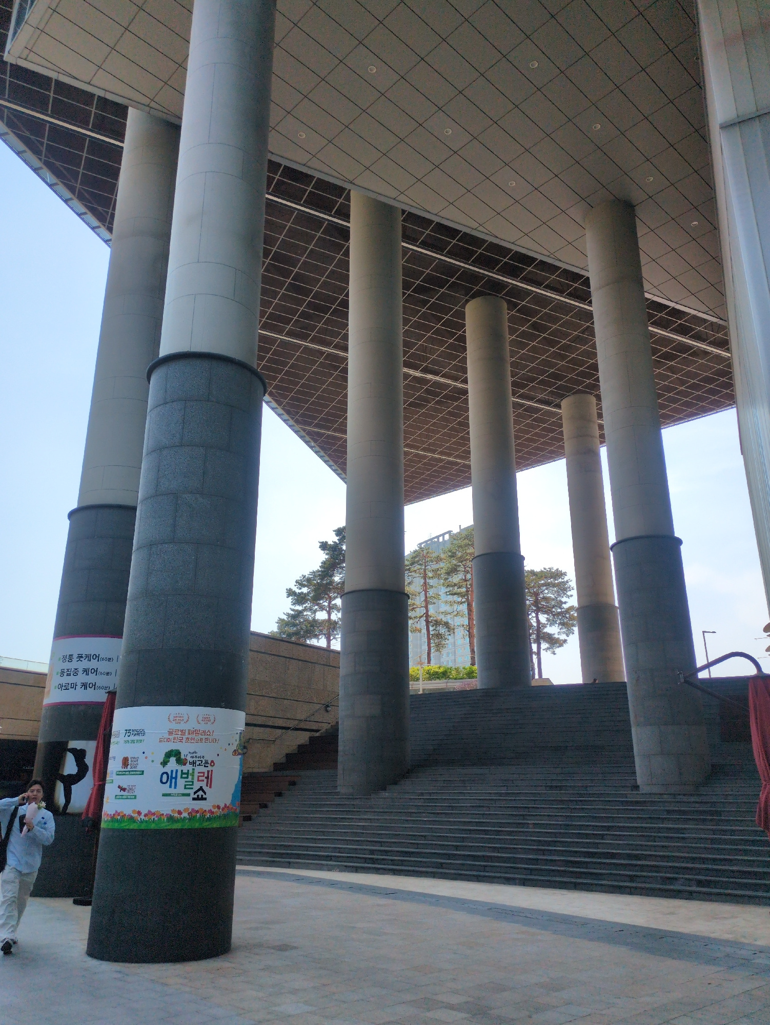 This is an eye-level, rotated, wide-angle shot taken outdoors, likely in Seoul, South Korea, as indicated by the Korean text on a poster. The image features a row of large cylindrical pillars, presuma…read more