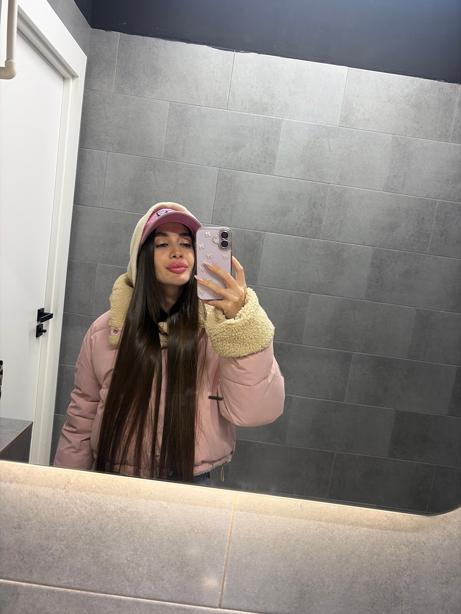 A young woman with long dark hair is taking a selfie in what appears to be a bathroom. She is wearing a pink puffer jacket with a cream-colored fleece collar and a matching pink baseball cap. She is h…read more