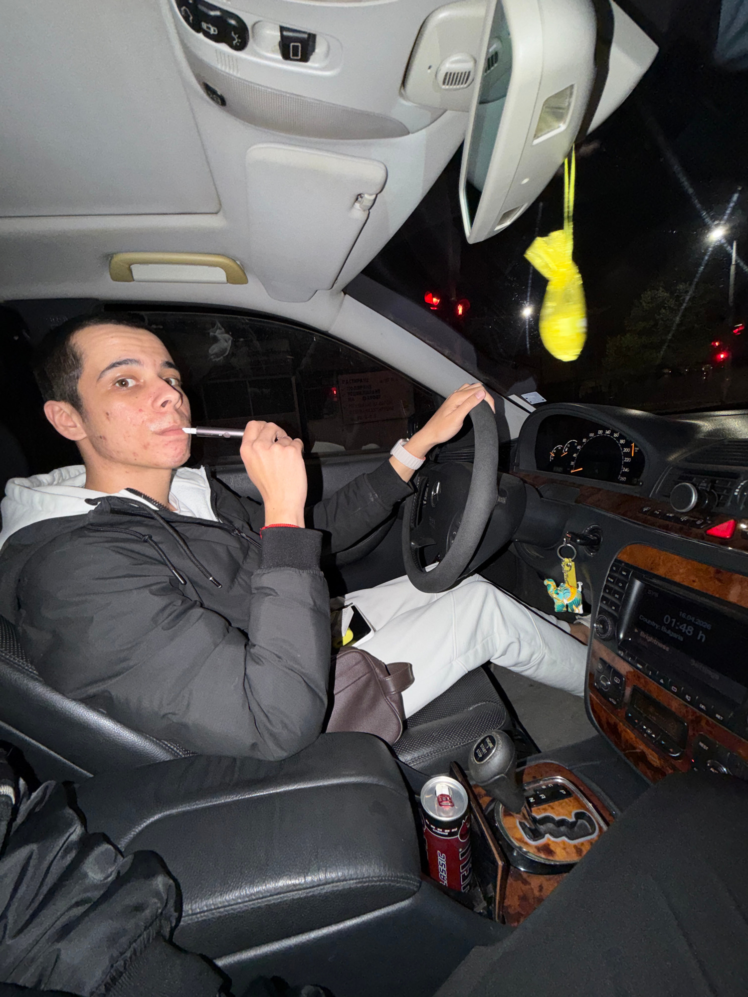 Inside a car, a young man is seated in the driver's seat, holding what appears to be a vape pen to his lips. He is wearing a black jacket and white pants. The car's dashboard displays "16.01.2026 01:4…read more