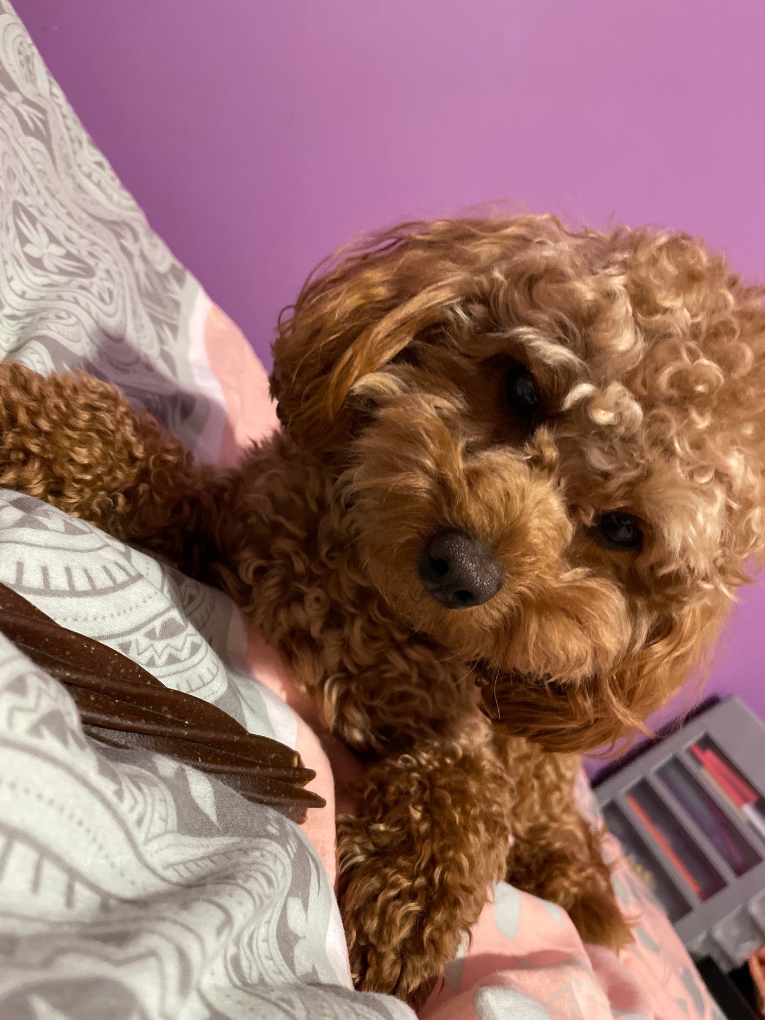 A brown poodle is lying on a bed covered with a patterned white, gray, and pink blanket. The dog is positioned in the lower center of the frame, looking towards the camera with a dark nose and eyes. A…read more