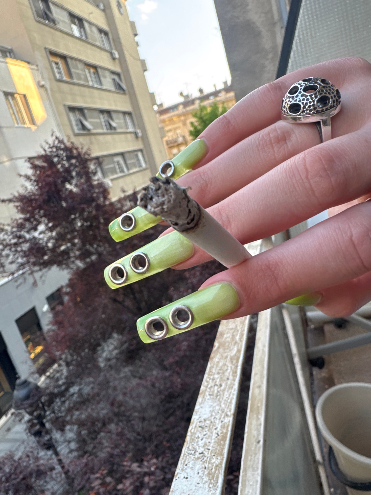 A close-up shot focuses on a person's hand holding a lit cigarette. The hand has pale skin and wears a silver ring with a round, perforated design on the index finger. The person has long, light-green…read more
