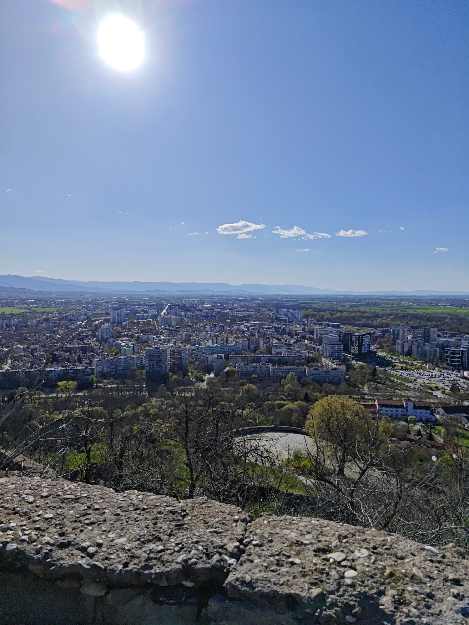 A high-angle, daytime view of Plovdiv, Bulgaria, is presented from Nebet Tepe. The sun is high in a mostly clear, bright blue sky with a few scattered white clouds. The city sprawls out below, consist…read more