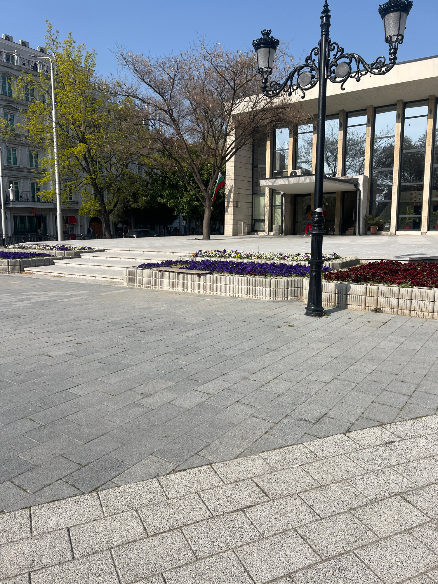 The image captures a street scene in Plovdiv, Bulgaria. In the foreground, there is a paved pedestrian walkway, with a distinct change in paving texture. Adjacent to the walkway is a tiered planter wi…read more