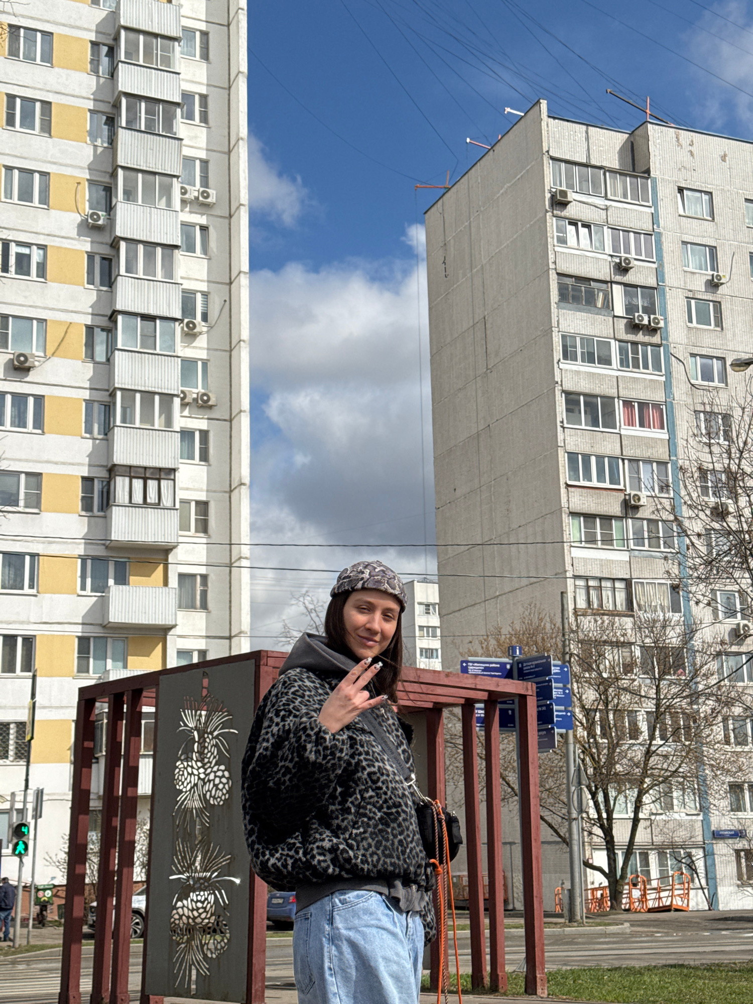 The image shows a woman standing on a bridge with a decorated metal railing in what appears to be a city setting. The woman, wearing a hat and a leopard-print jacket, is making a peace sign with her h…read more
