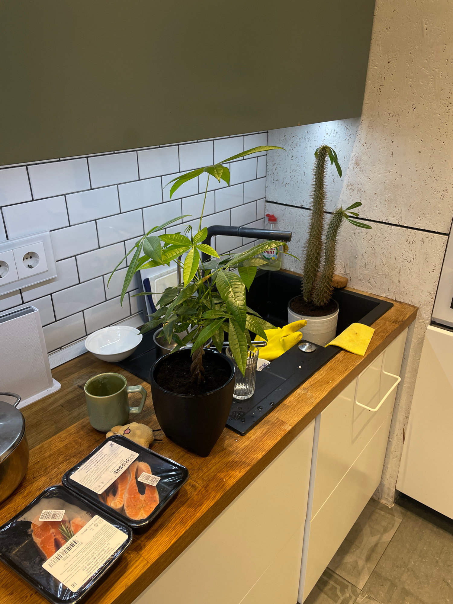 Here is a forensic description of the image. The image depicts a kitchen setting. Two potted plants are visible, one appearing to be a Madagascar palm or similar succulent type plant in a grey pot, a…read more