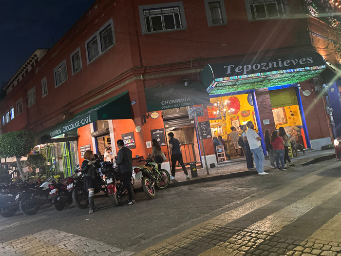 The image displays a nighttime street scene in the Coyoacán borough of Mexico City, Mexico. A two-story building with an orange-red facade dominates the background, featuring multiple windows on the u…read more