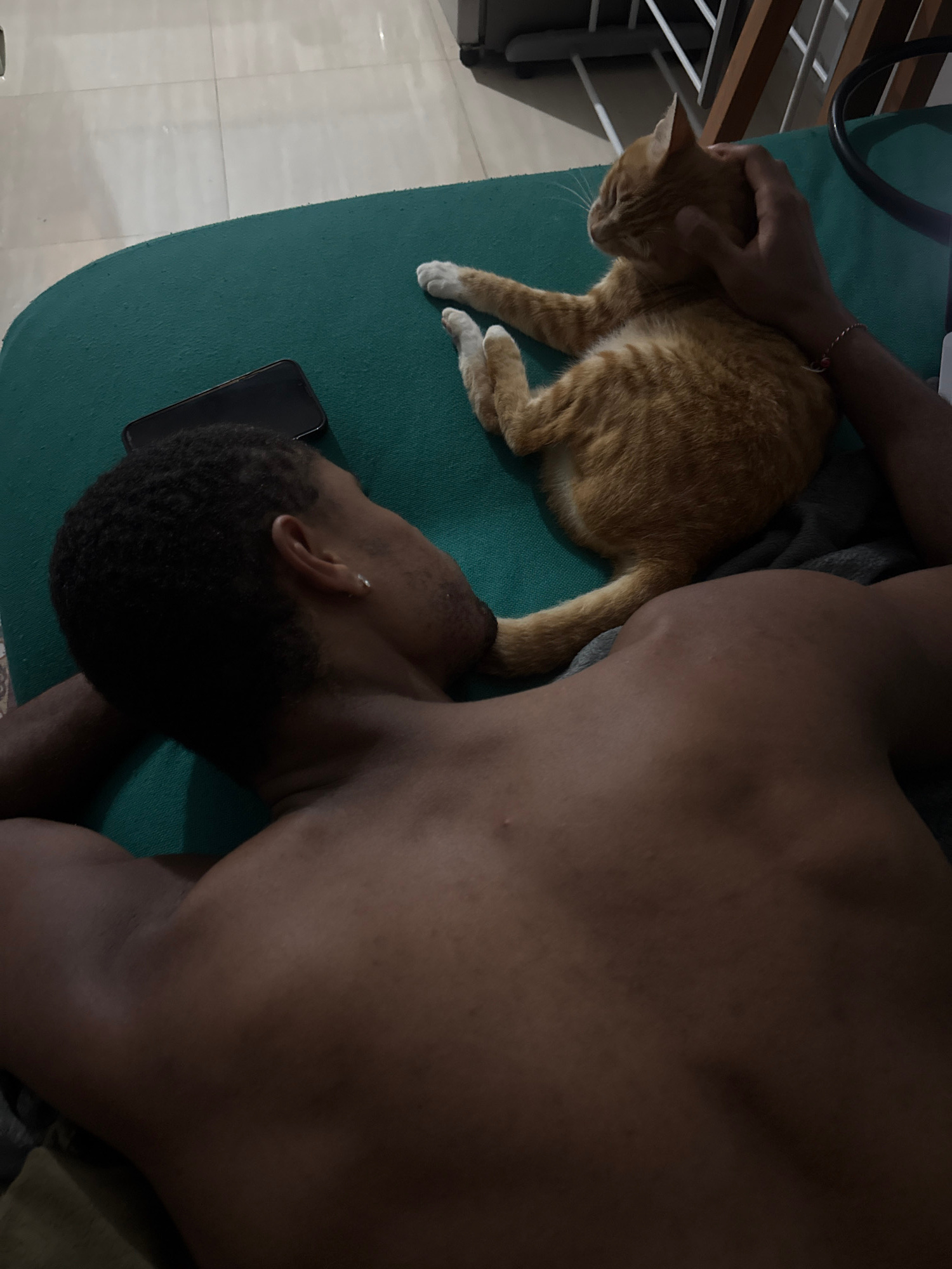 An overhead shot shows a shirtless black man lying on his left side on a green surface, possibly a bed or mat. His head is near the bottom of the frame, angled slightly to the left, and a black smartpβ¦read more