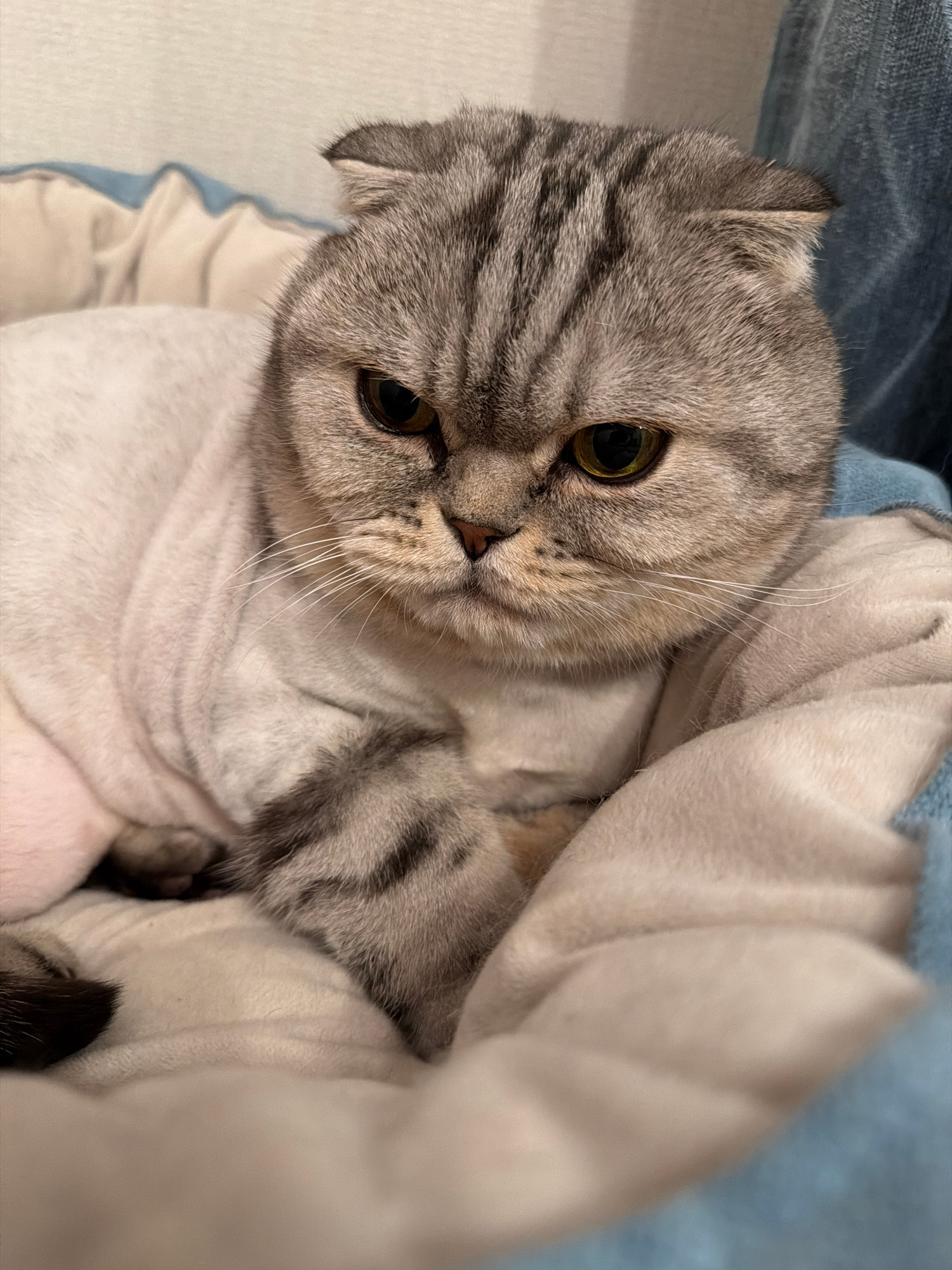 A grey tabby cat with folded ears is curled up in a light-colored blanket. The cat is looking at the camera with its yellow-green eyes. The scene appears to be indoors. There is no information to sugg…read more
