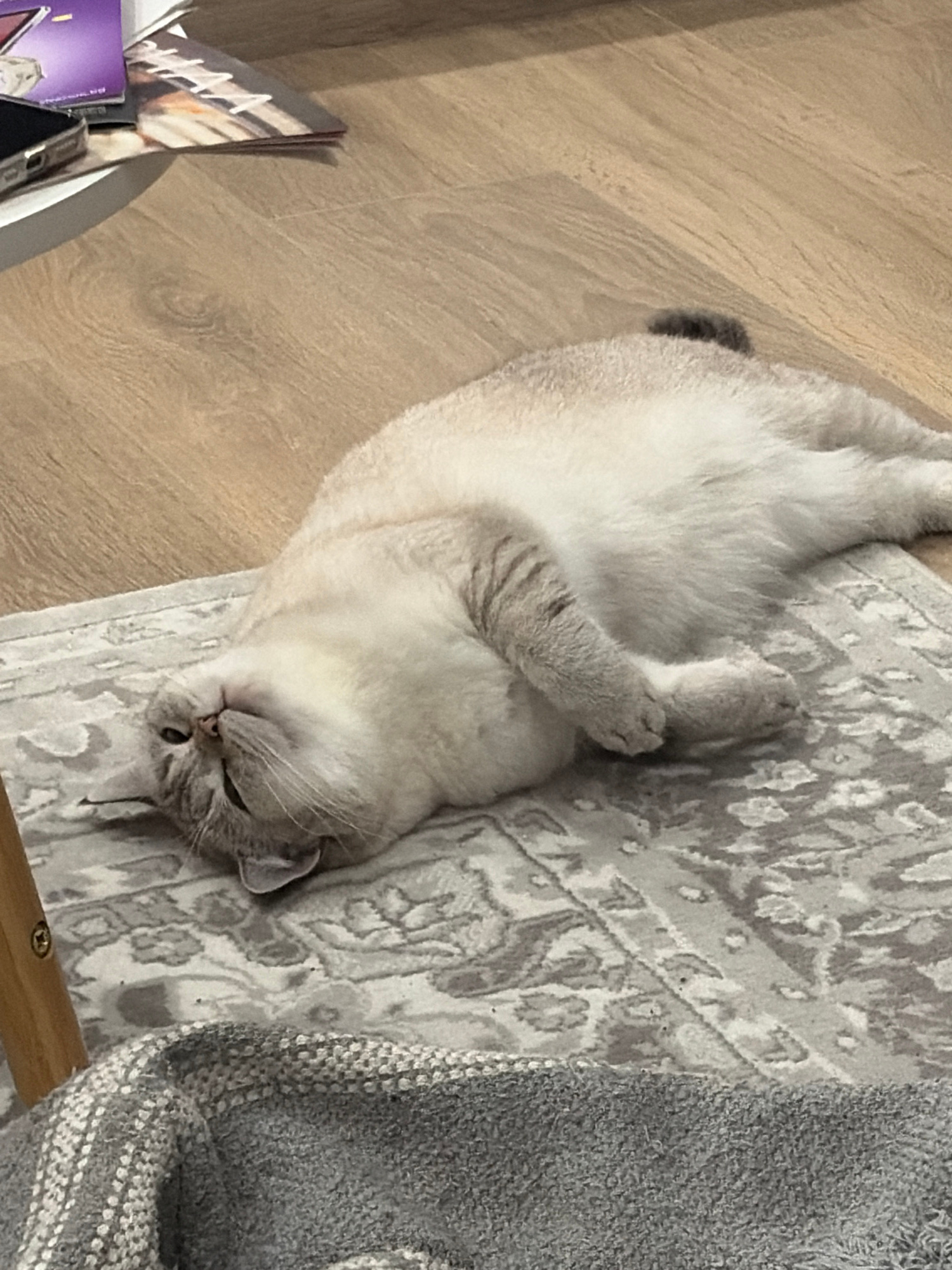 A light gray, fluffy cat lies on its back on a patterned gray and white rug, its paws crossed over its chest. The rug sits atop a wooden floor. To the left of the cat, on the floor, are some magazines…read more