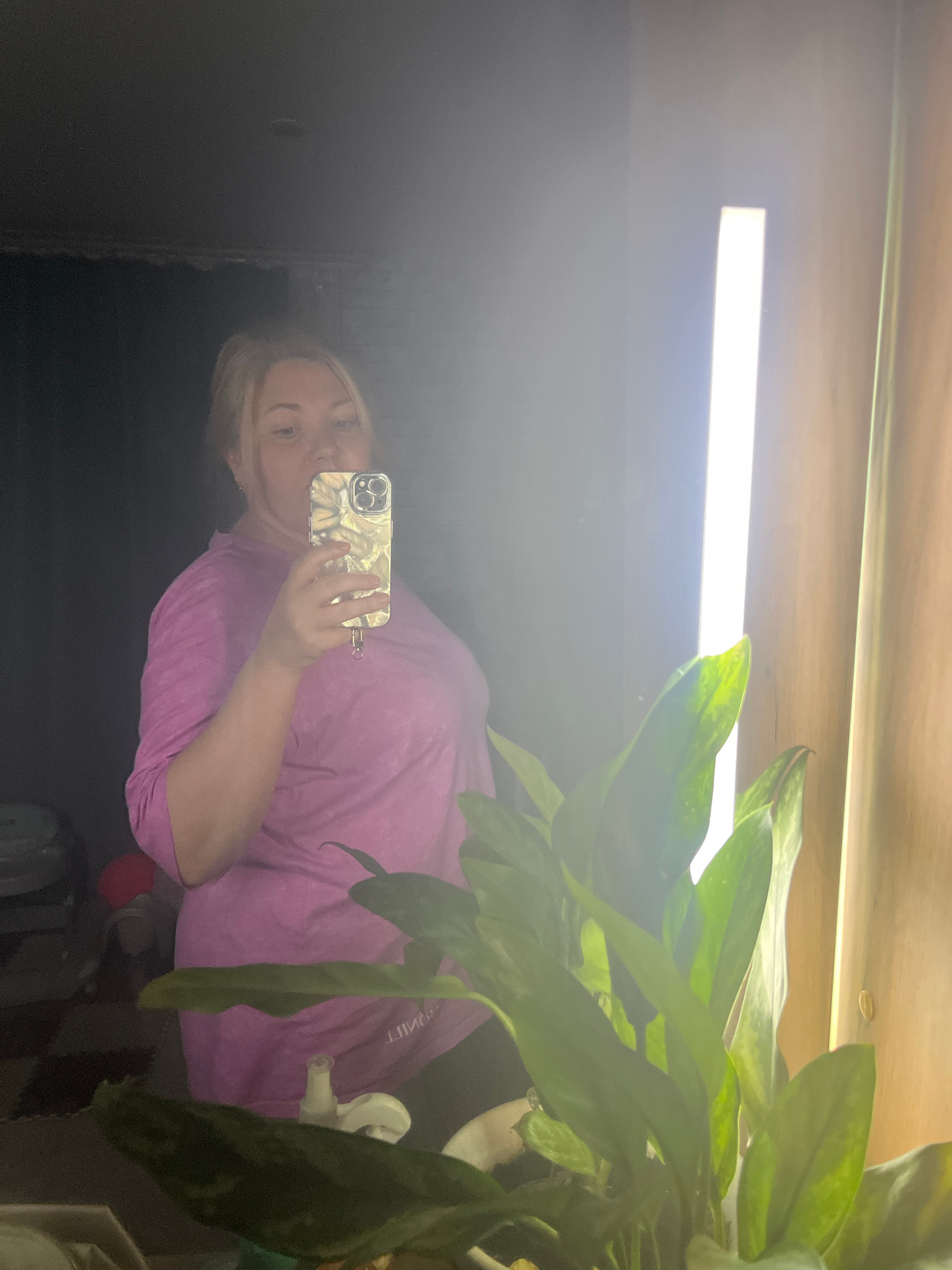 A person is taking a selfie in a mirror. The person has blond hair and is wearing a purple t-shirt. The person is holding a smartphone with a gold-colored case. A plant is visible on the right side of…read more