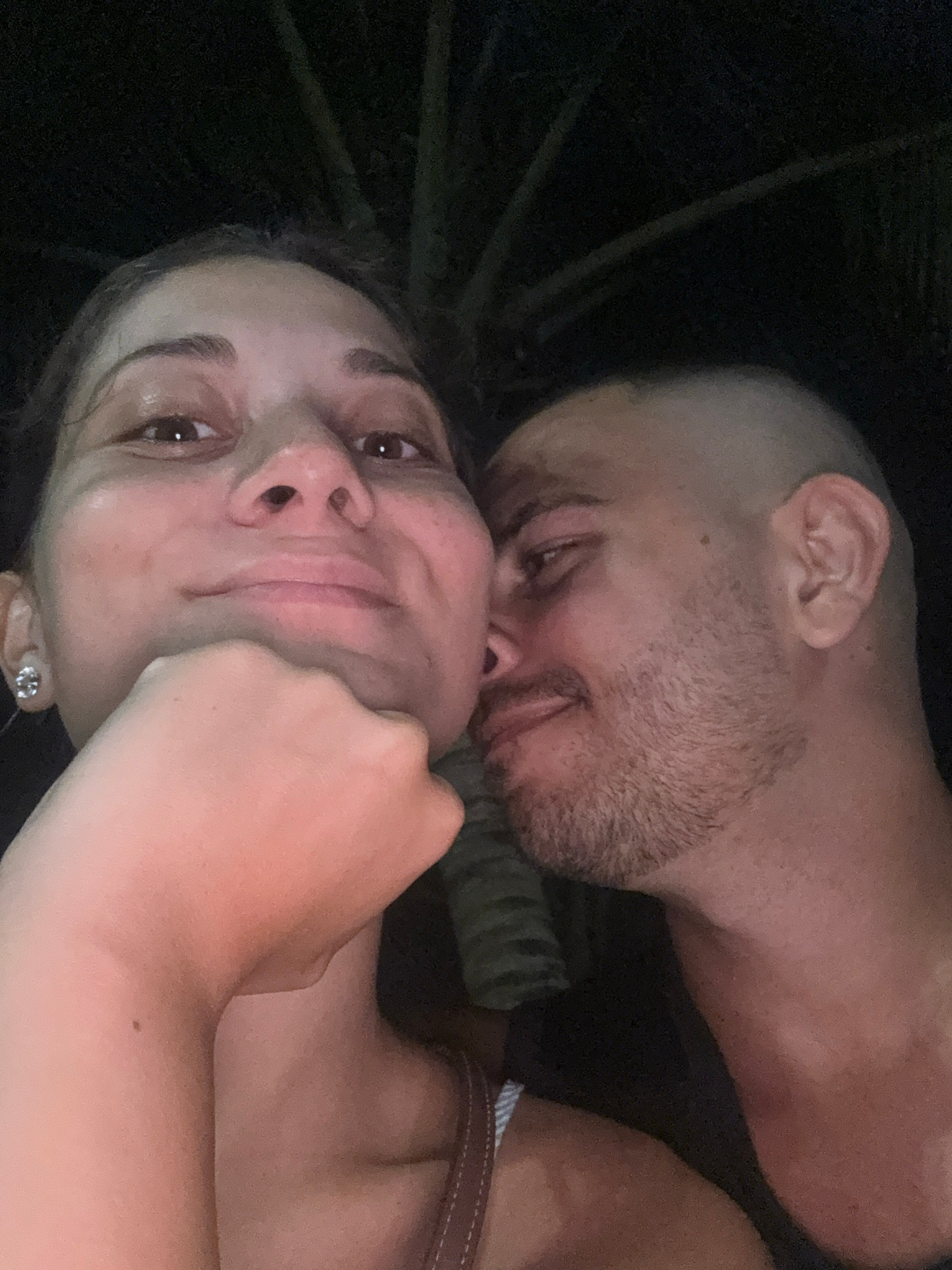 A close-up, vertically oriented photograph shows a woman and a man embracing. The woman, in the foreground, is fair-skinned and looks at the camera. Her right hand is near her face. She has dark hair…read more