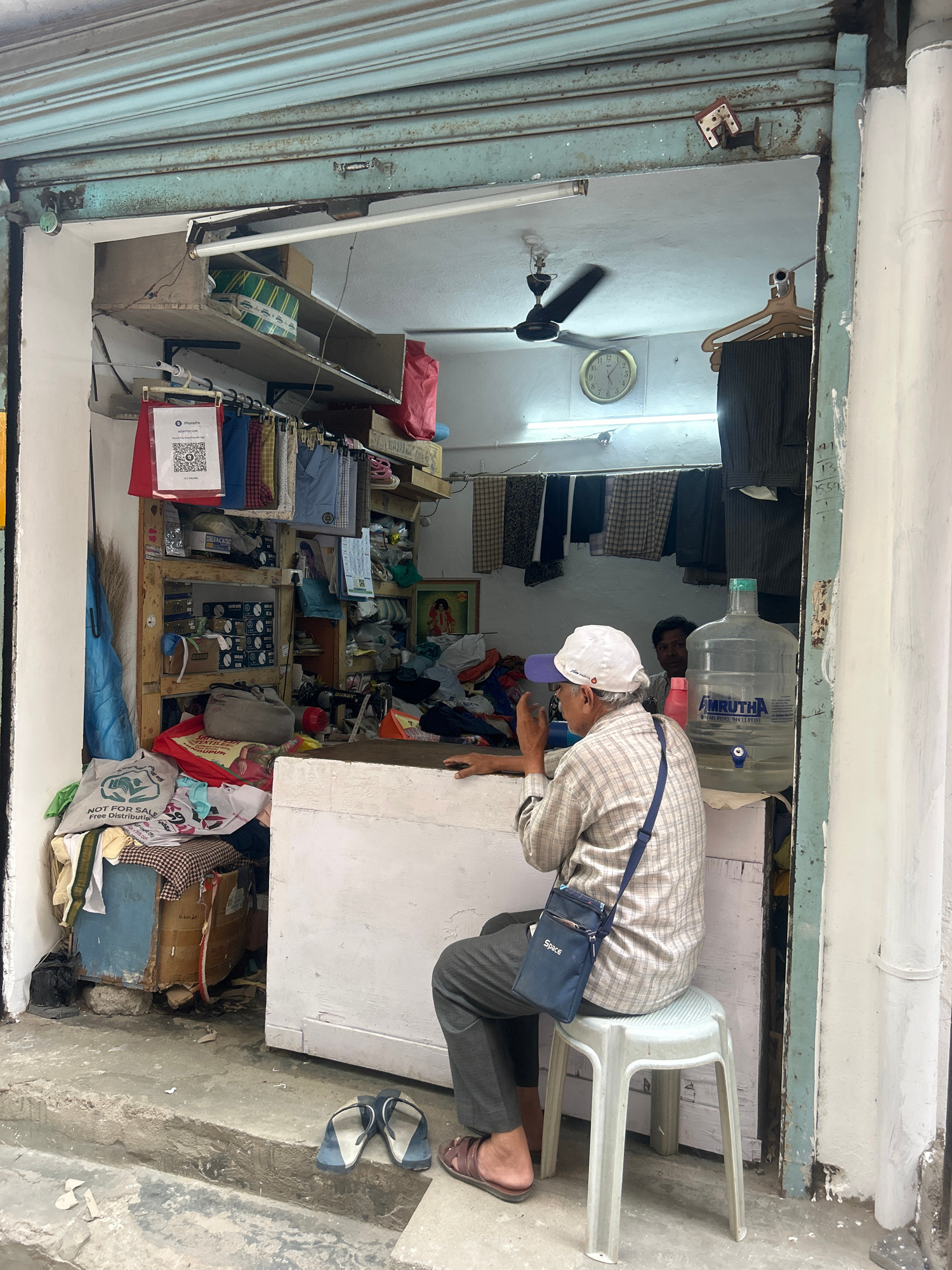 This image depicts a small, open-front shop in Puttaparthi, India, likely a tailor or general repair establishment, viewed from a slight elevation outside. The entrance features a partially raised, fa…read more