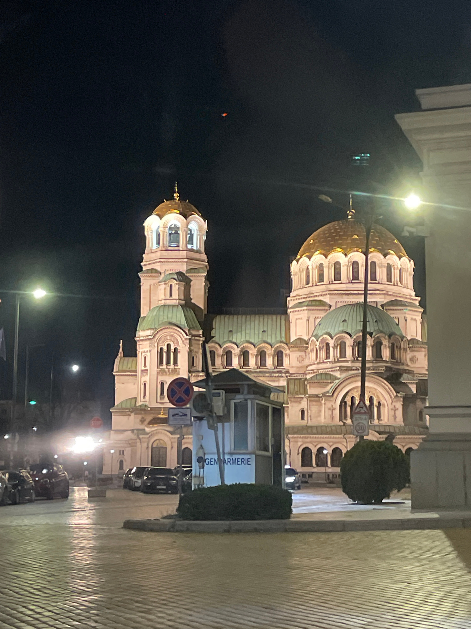 The image captures the Alexander Nevsky Cathedral in Sofia, Bulgaria, at night. The cathedral is illuminated, showcasing its golden domes and intricate architectural details. The sky is dark. Streetli…read more