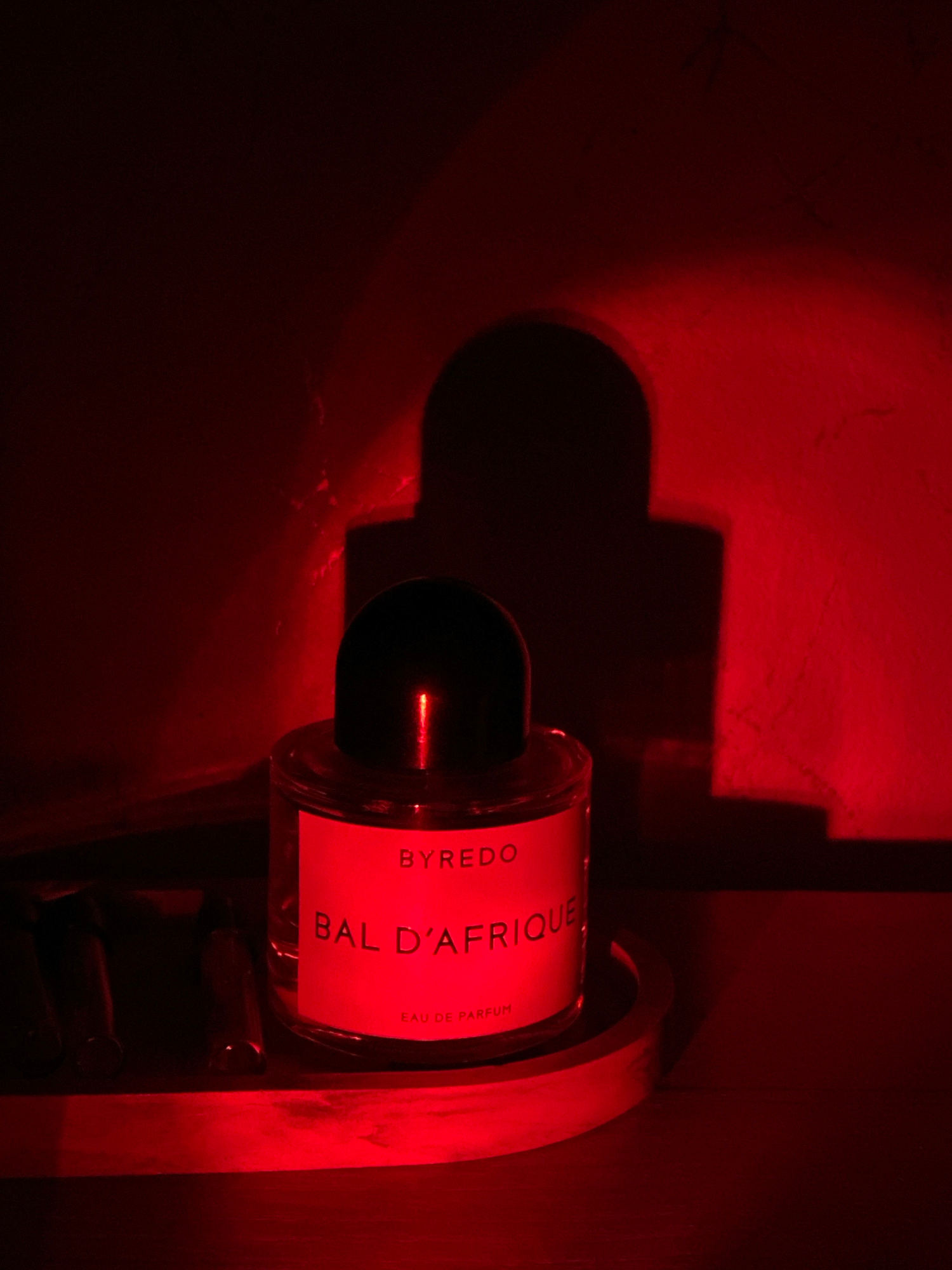 The image displays a Byredo "Bal d'Afrique" Eau de Parfum bottle, oriented horizontally, against a deeply red-lit background. The setting appears to be indoors, possibly on a wooden shelf or within a…read more