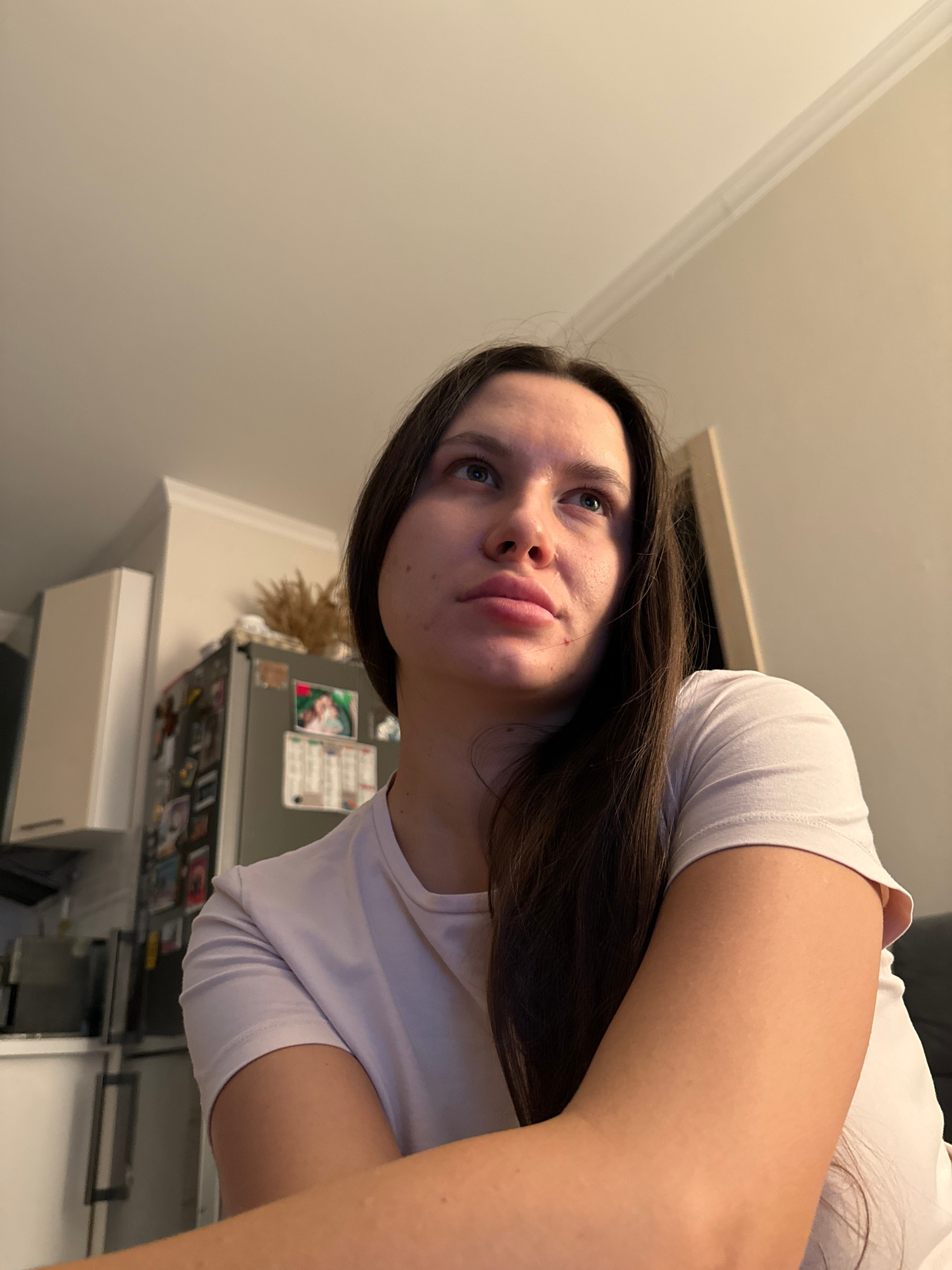 A low-angle indoor shot captures a woman wearing a white t-shirt. She has long, dark hair and is looking upwards and slightly to the left. Behind her, a refrigerator is visible, covered with magnets a…read more