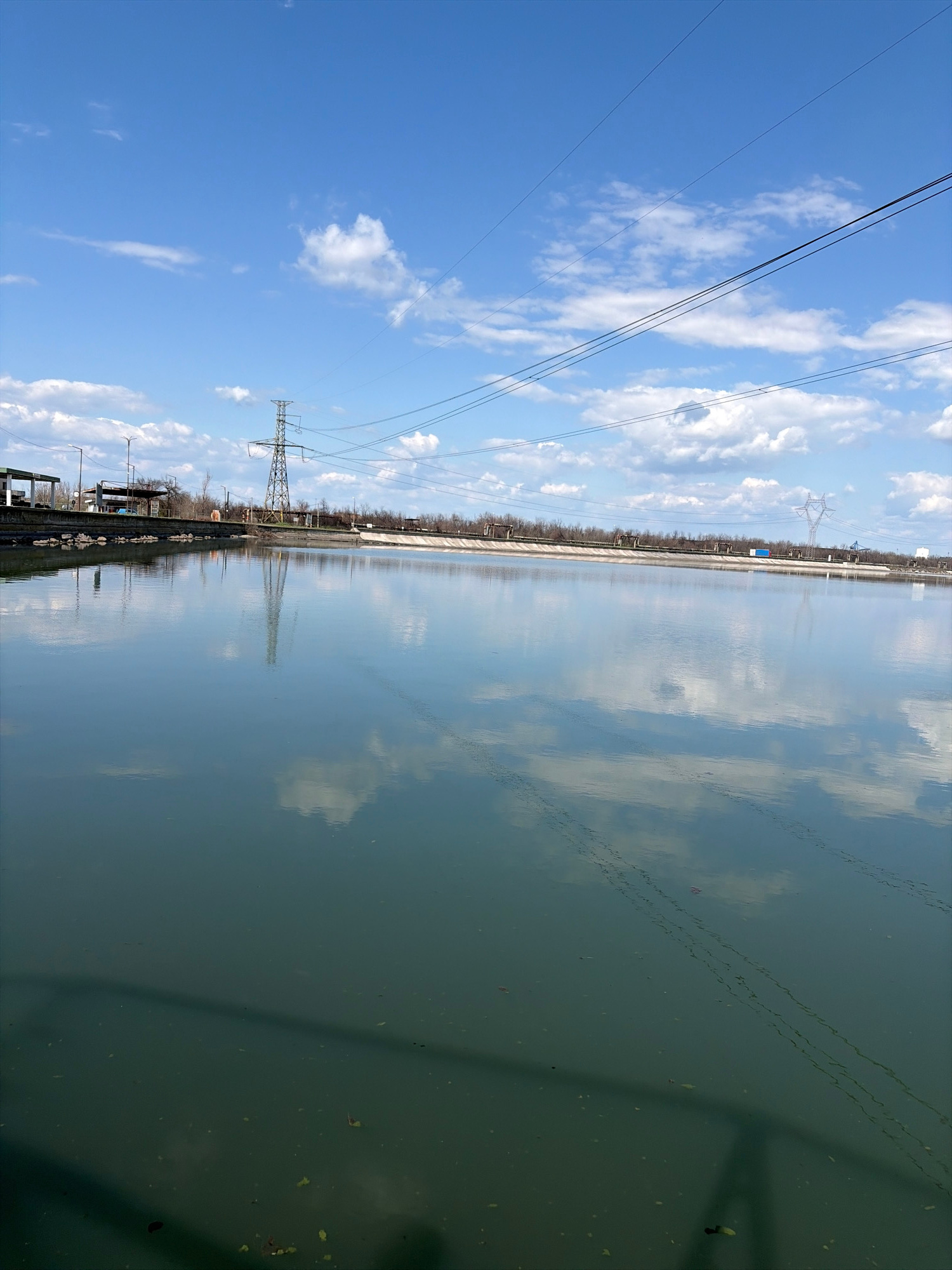 The photograph shows a body of water, likely a lake or wide river, in Galabovo, Bulgaria. Overhead power lines and a transmission tower are visible on the left side of the frame against a blue sky wit…read more