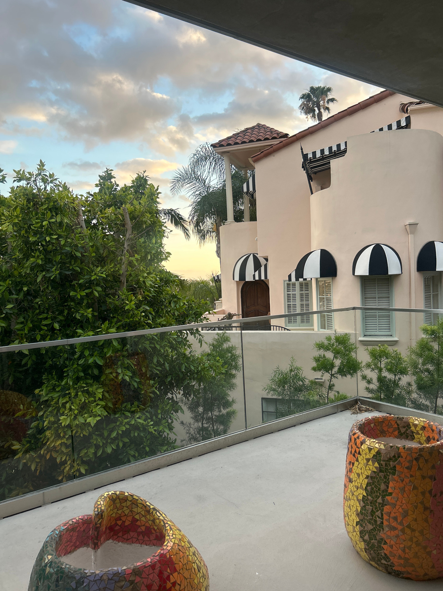 The image depicts an exterior scene in what appears to be a residential or commercial area. The perspective is low-angle, looking upwards. The main focal point is a building with a light-colored faca…read more