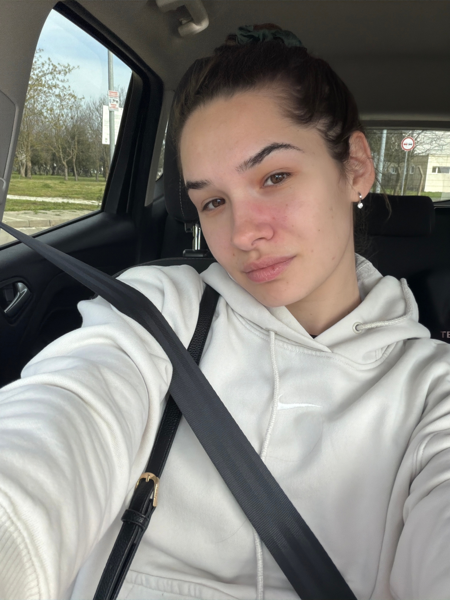 A medium shot, slightly angled, shows a young adult female in the driver's seat of a car. She has brown hair, brown eyes, and is wearing a white Nike hoodie. A black seatbelt crosses her chest. Outsid…read more