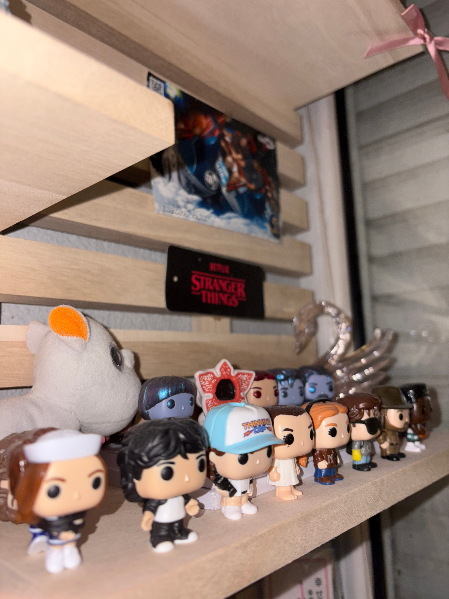 The image shows a collection of items within a wooden box or tray, possibly a storage container or display case. The items include: * Several Funko Pop figurines, apparently from the "Stranger Thin…read more