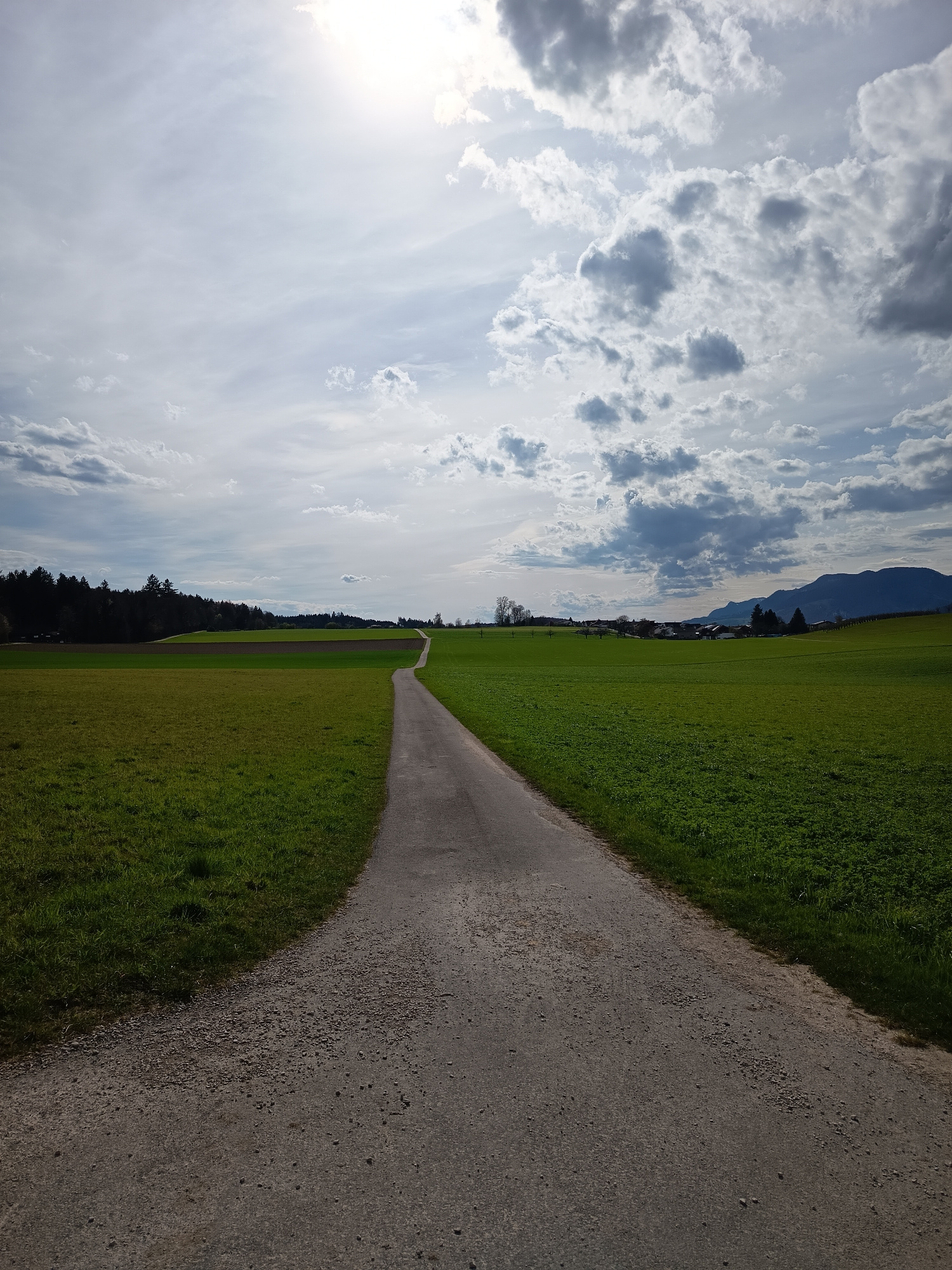 The image depicts a rural scene, possibly located in the vicinity of Neuendorf, Switzerland, though specific landmarks confirming this are not evident. A narrow, unpaved road stretches into the distan…read more
