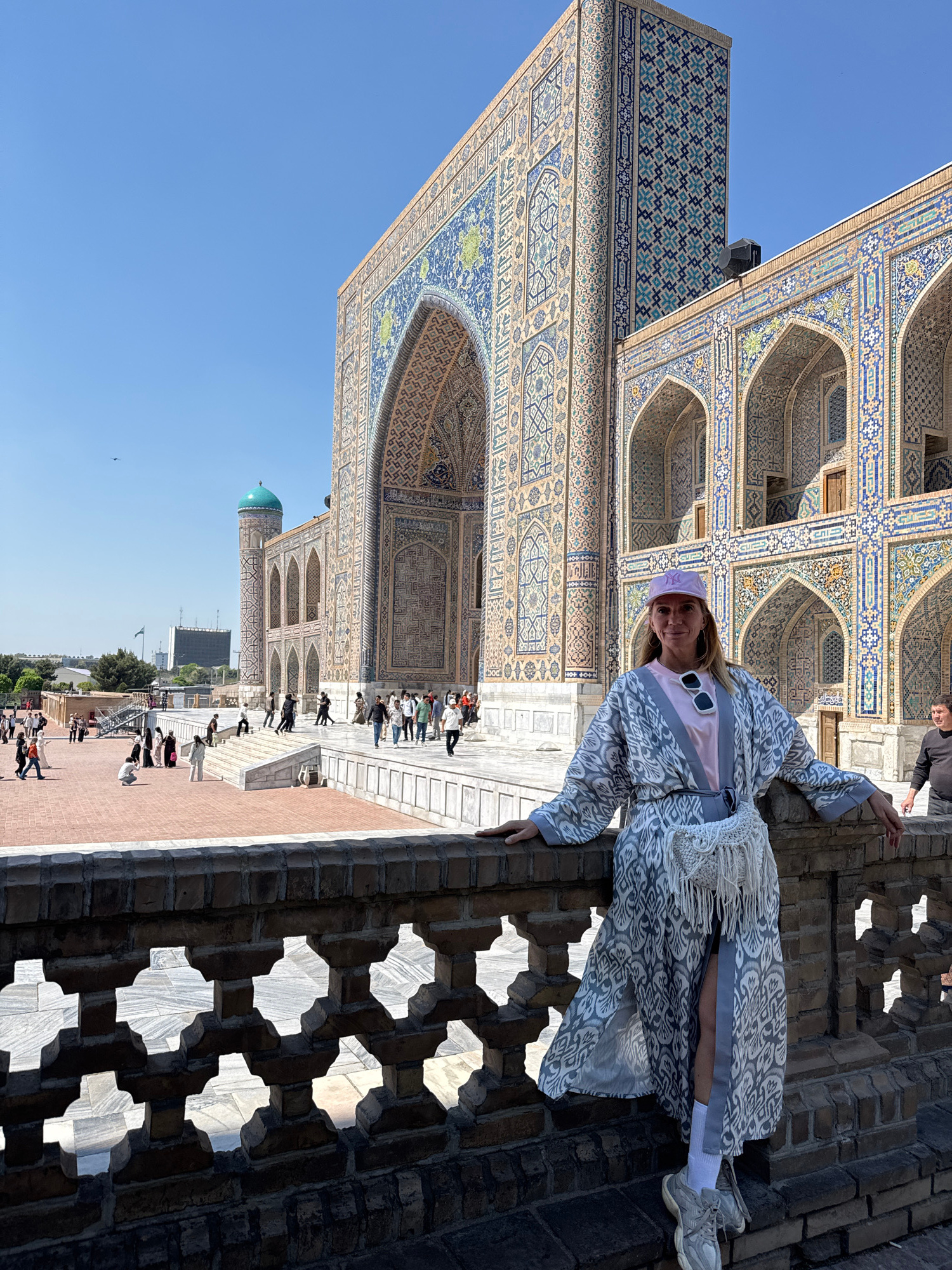 A medium shot depicts a person standing in front of the Tilya Kori Madrasah in Samarkand City, Uzbekistan. The person is wearing a long, patterned coat, a light pink top, white socks, and athletic sho…read more