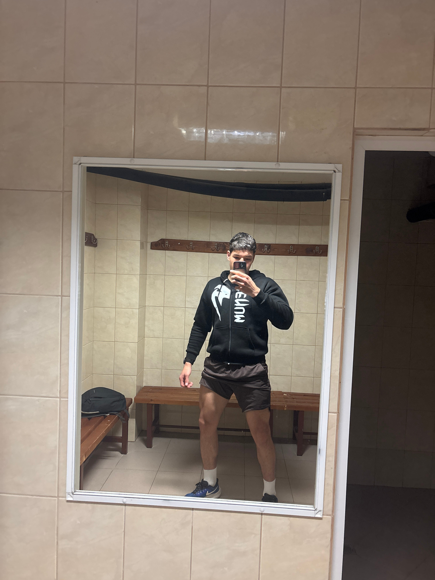 A man is taking a selfie in a locker room mirror. The locker room has tiled walls and floors. The man is wearing a black hoodie with white lettering and a white Nike logo, brown shorts, white socks, a…read more