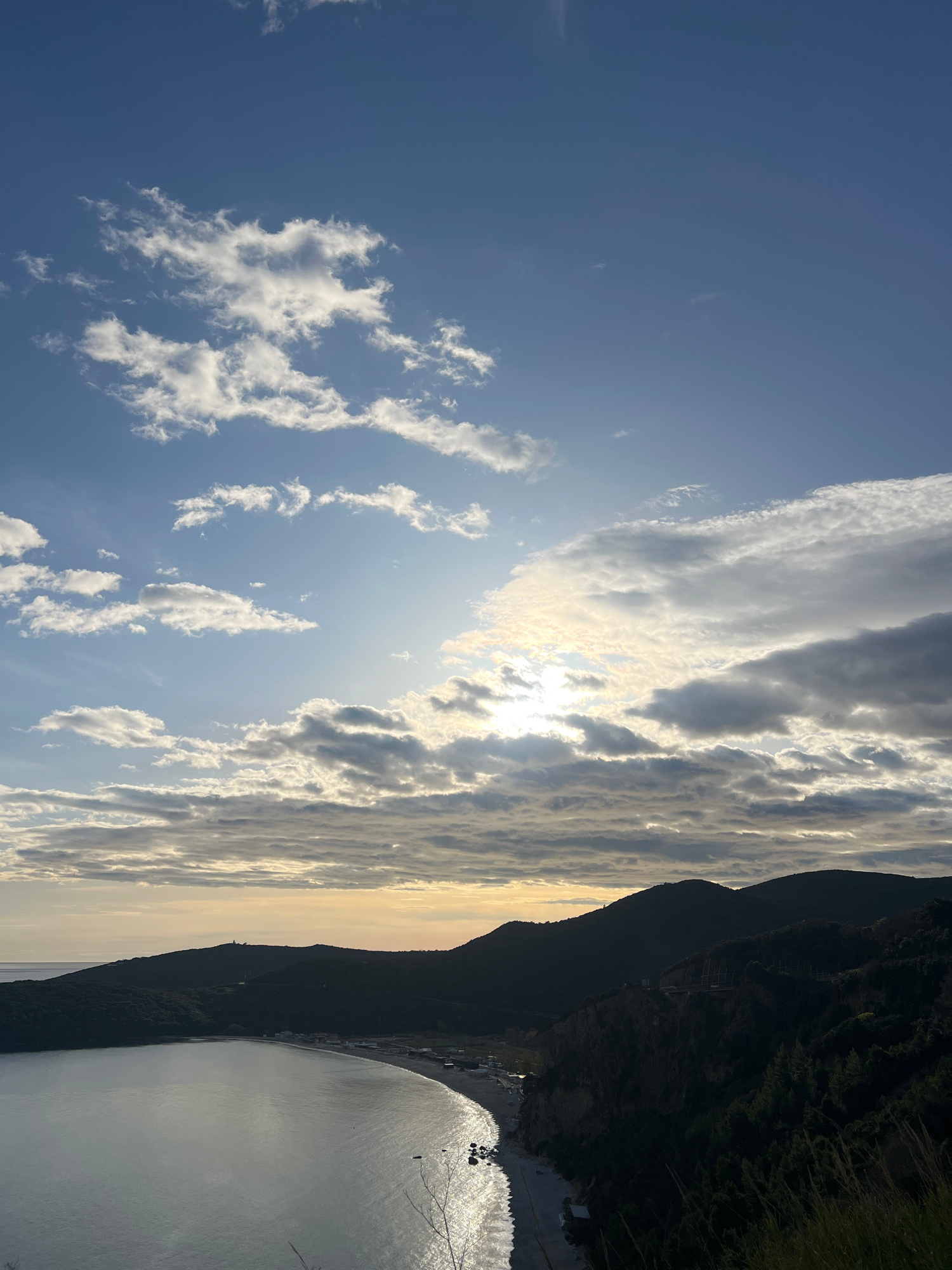 The image shows a coastline in Prijevor, Montenegro. A mountain ridge extends along the right side of the frame, bordering the edge of a body of water. A beach with a few buildings is nestled at the bβ¦read more