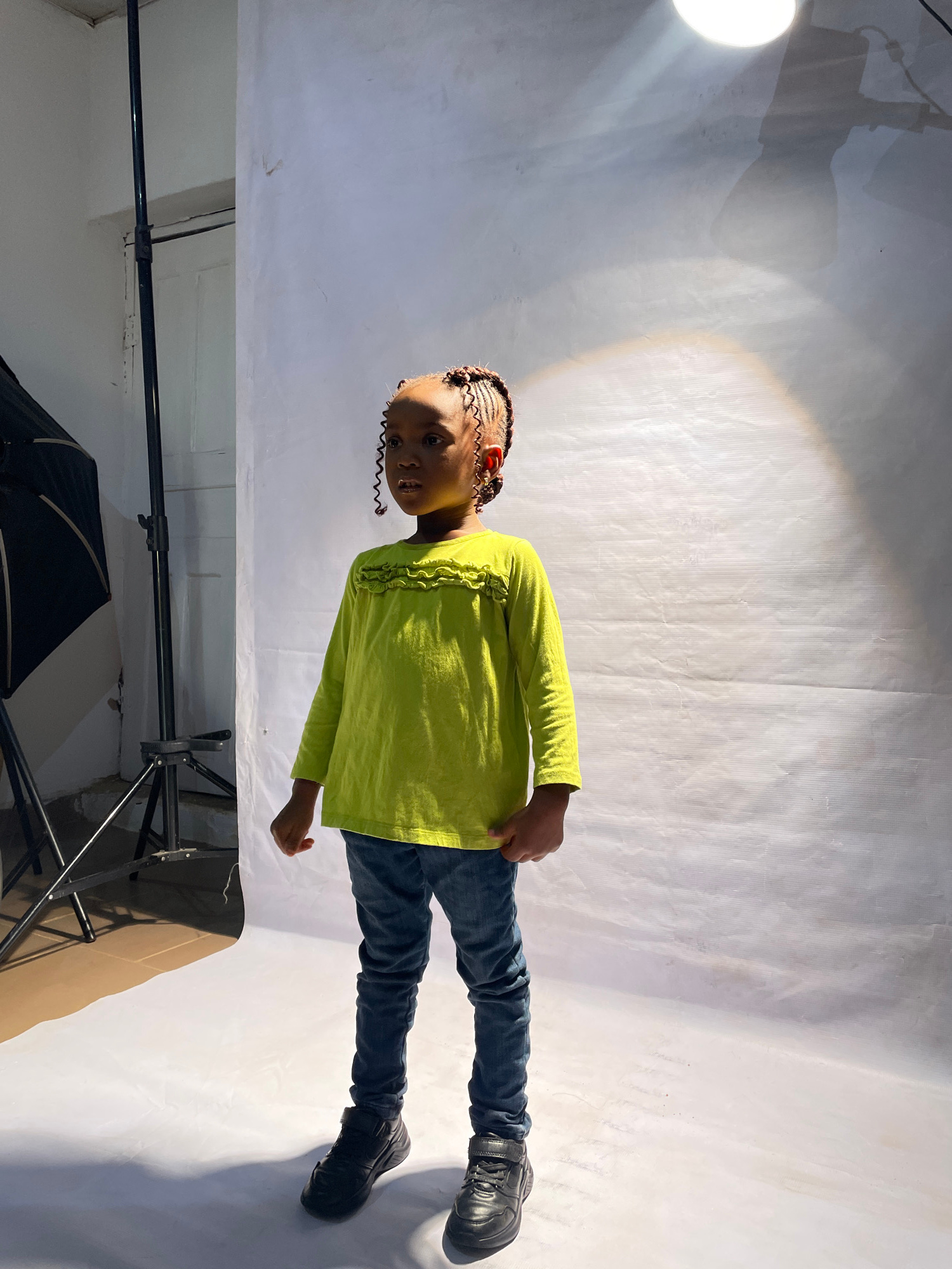 The image shows a young girl standing in a photo studio. She is wearing a lime green long-sleeved shirt, blue jeans, and black shoes. Her hair is styled in braids. The background is a white backdrop.…read more