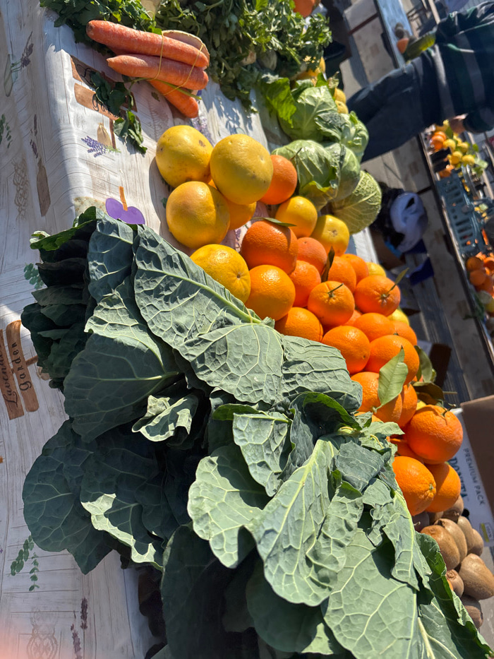 The scene captures an outdoor market stall in the City of Zagreb, Croatia, under direct sunlight. The primary focus is an assortment of fresh produce displayed on a white tablecloth patterned with lav…read more