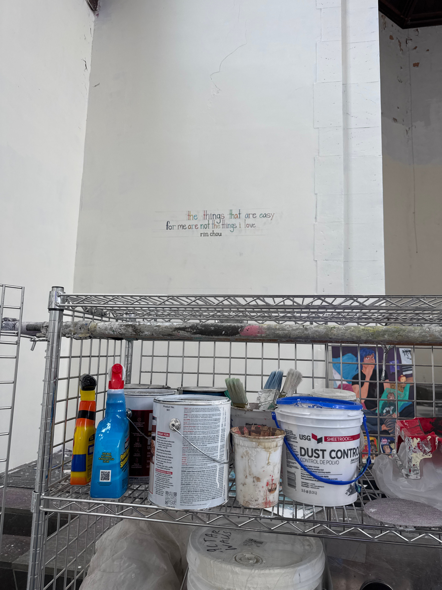 Here's a description of the image: The image shows a cluttered scene with a focus on painting and cleaning supplies. The location appears to be indoors, potentially a storage area or workspace. On t…read more
