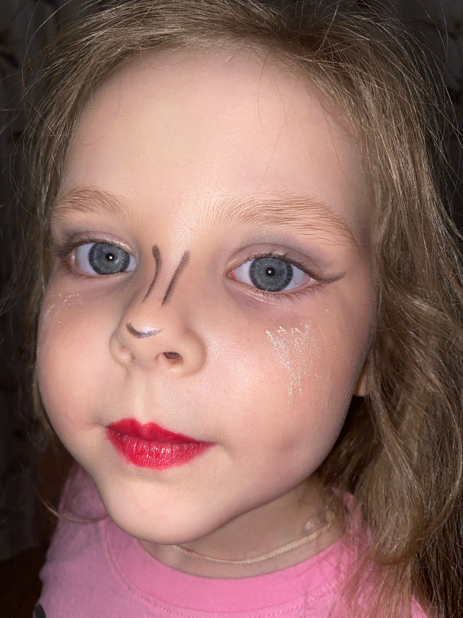 This close-up portrait, taken in Votkinsk, Russia, features a young child, likely a girl, with fair skin, light blonde or light brown hair, and striking blue-grey eyes. The image is rotated, presentin…read more