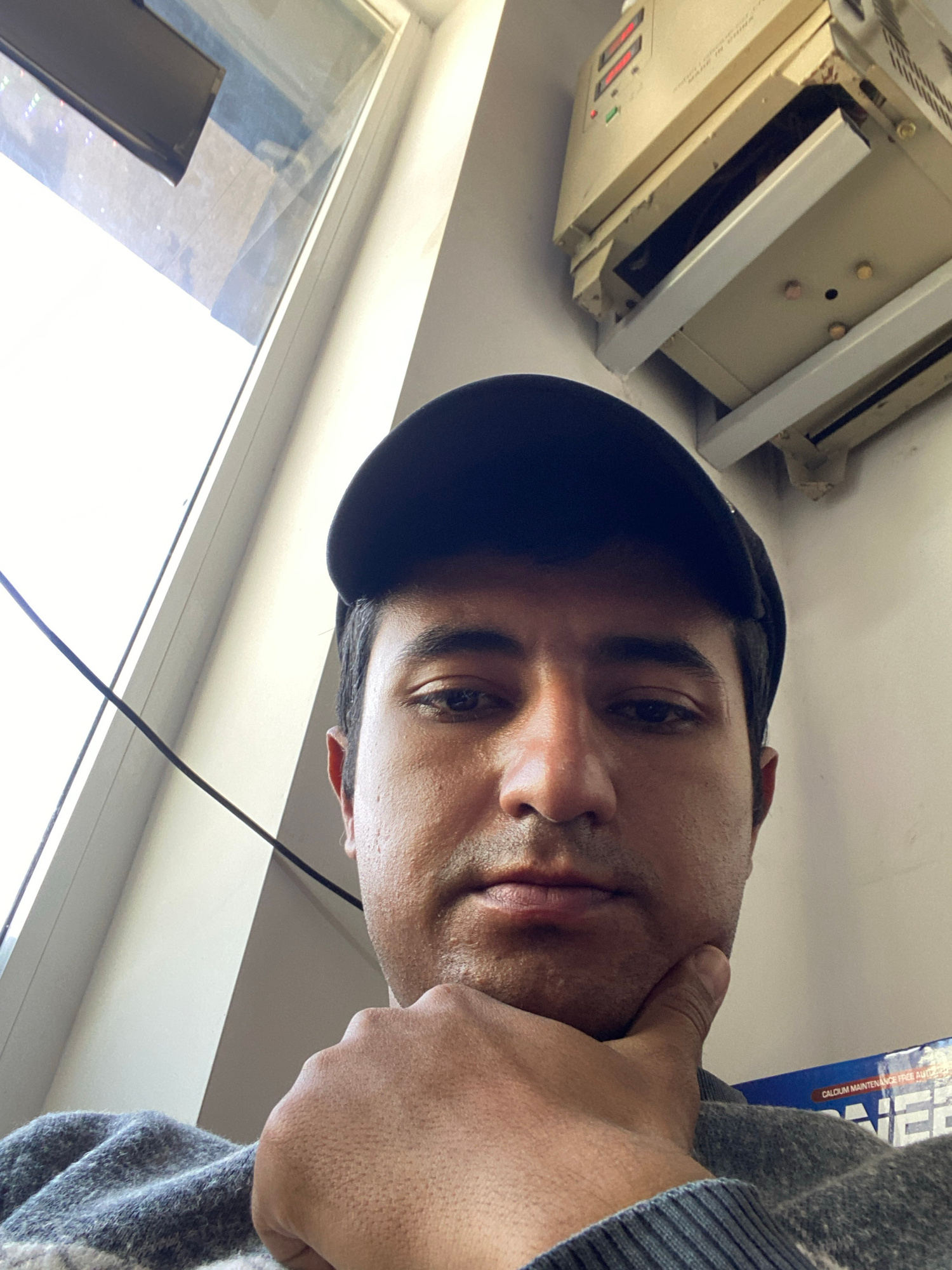 A man with short dark hair, wearing a black baseball cap and a gray sweater, is looking directly at the camera. His right hand is raised to his face, with his fingers touching his cheek. He is positio…read more