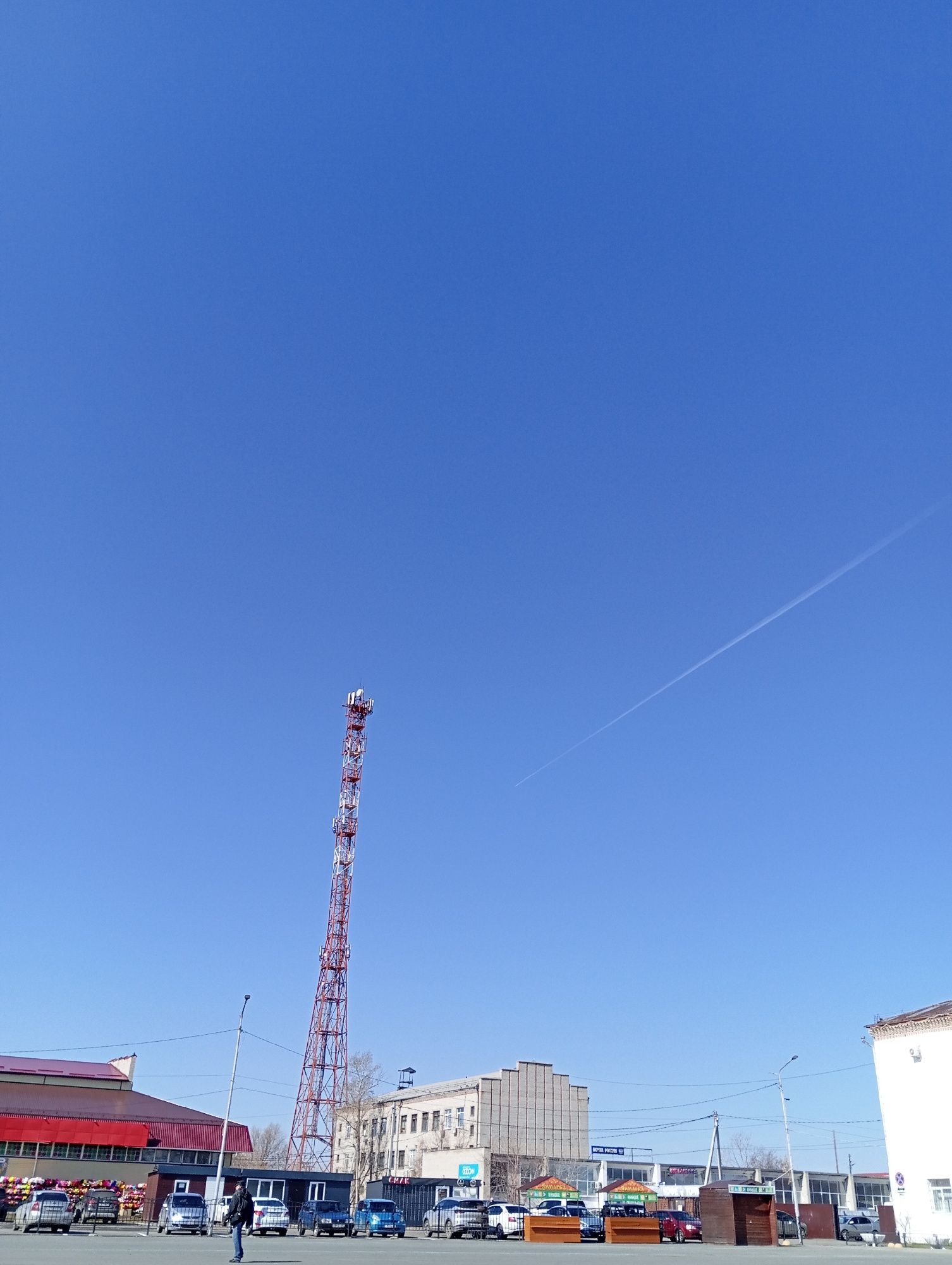 The image depicts a clear, blue sky above a street scene in Yurgamysh, Russia. A contrail from an aircraft is visible in the upper portion of the sky. A tall, red and white telecommunications tower st…read more