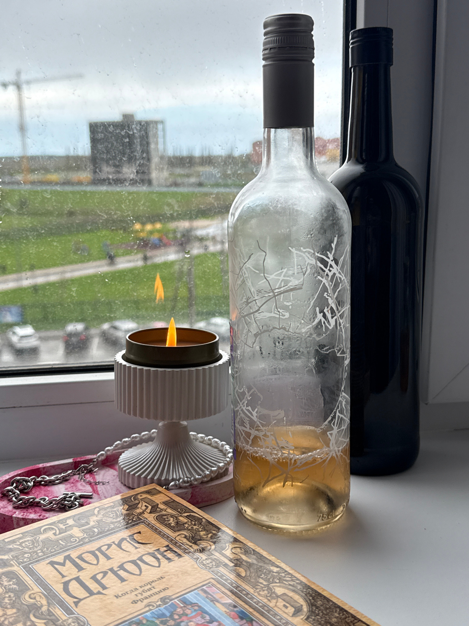 On a windowsill, a scene unfolds: a black wine bottle rests above a clear bottle adorned with white designs, partially filled with a golden liquid. In front of the bottles, a lit candle sits in a whit…read more