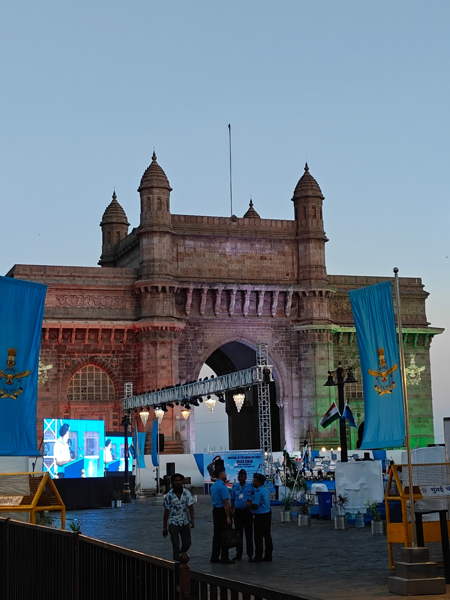 The image captures a view of the Gateway of India in Mumbai. A stage has been set up in front of the gate, likely for an event, with a large screen displaying visuals. Several people are standing and…read more