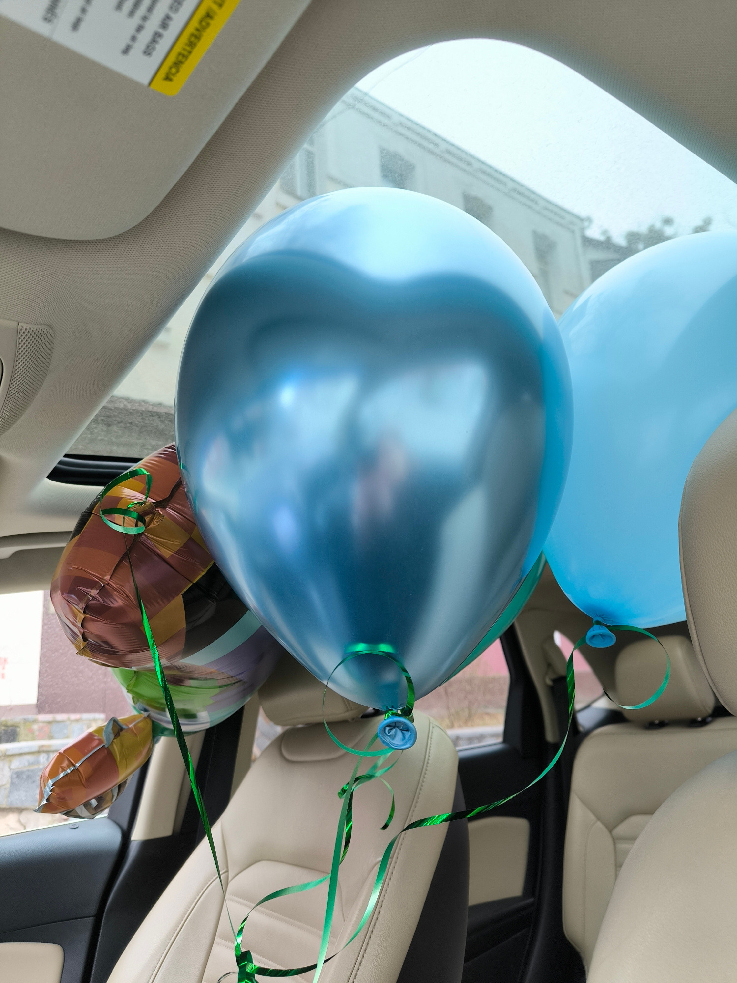 The interior of a vehicle is filled with inflated balloons. There are two blue round balloons and one foil balloon with brown, purple, and yellow patterns. Green ribbons are attached to each balloon.…read more