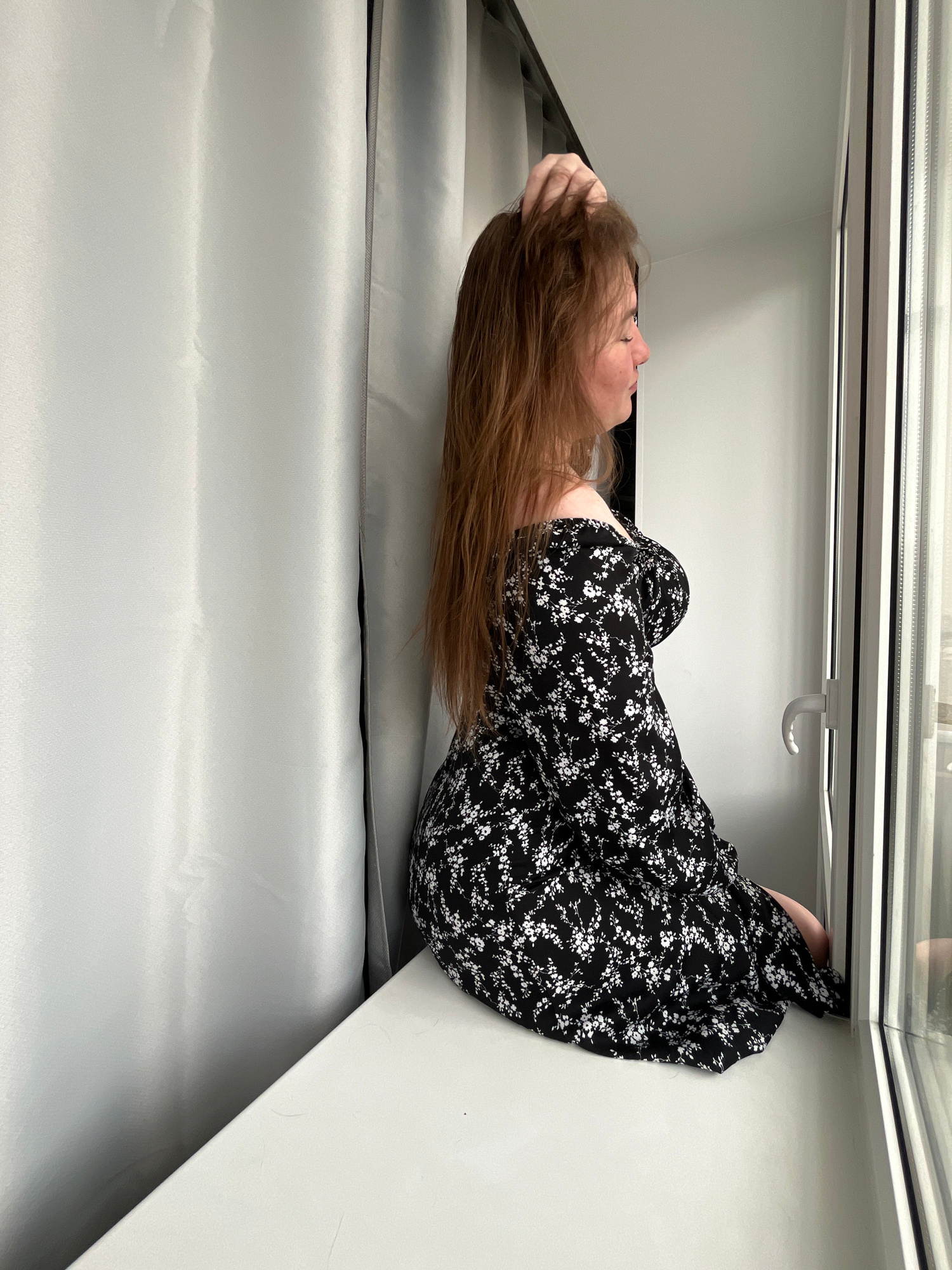 A young woman with reddish-brown hair is positioned near a window in what appears to be an interior space. She is wearing a black dress with a white floral pattern. Her left hand is raised to her head…read more