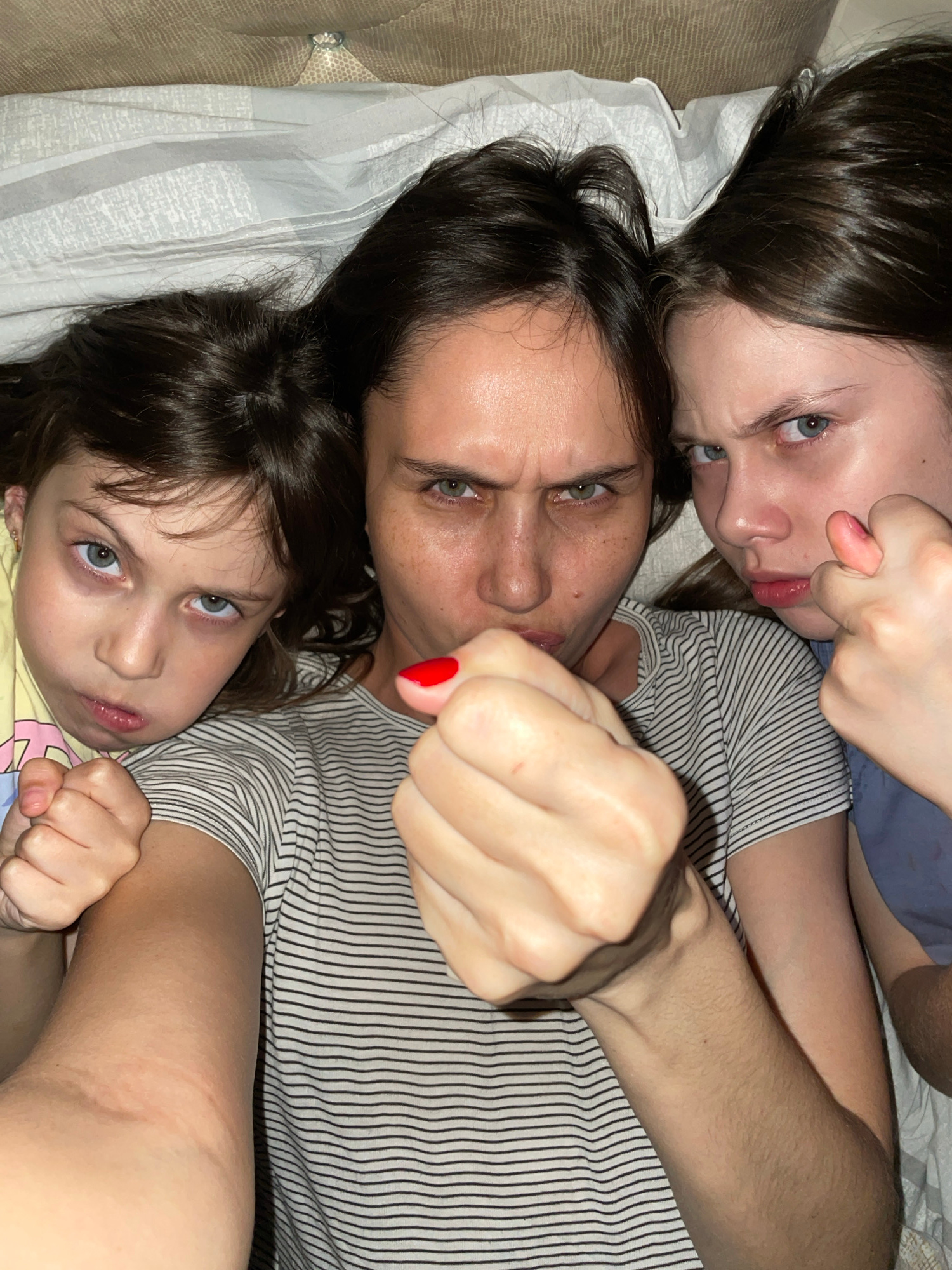 Three individuals are lying together on a bed. The primary figure is an adult woman with dark hair, positioned in the center. Above her is a young girl with dark hair, and below is another young girl…read more