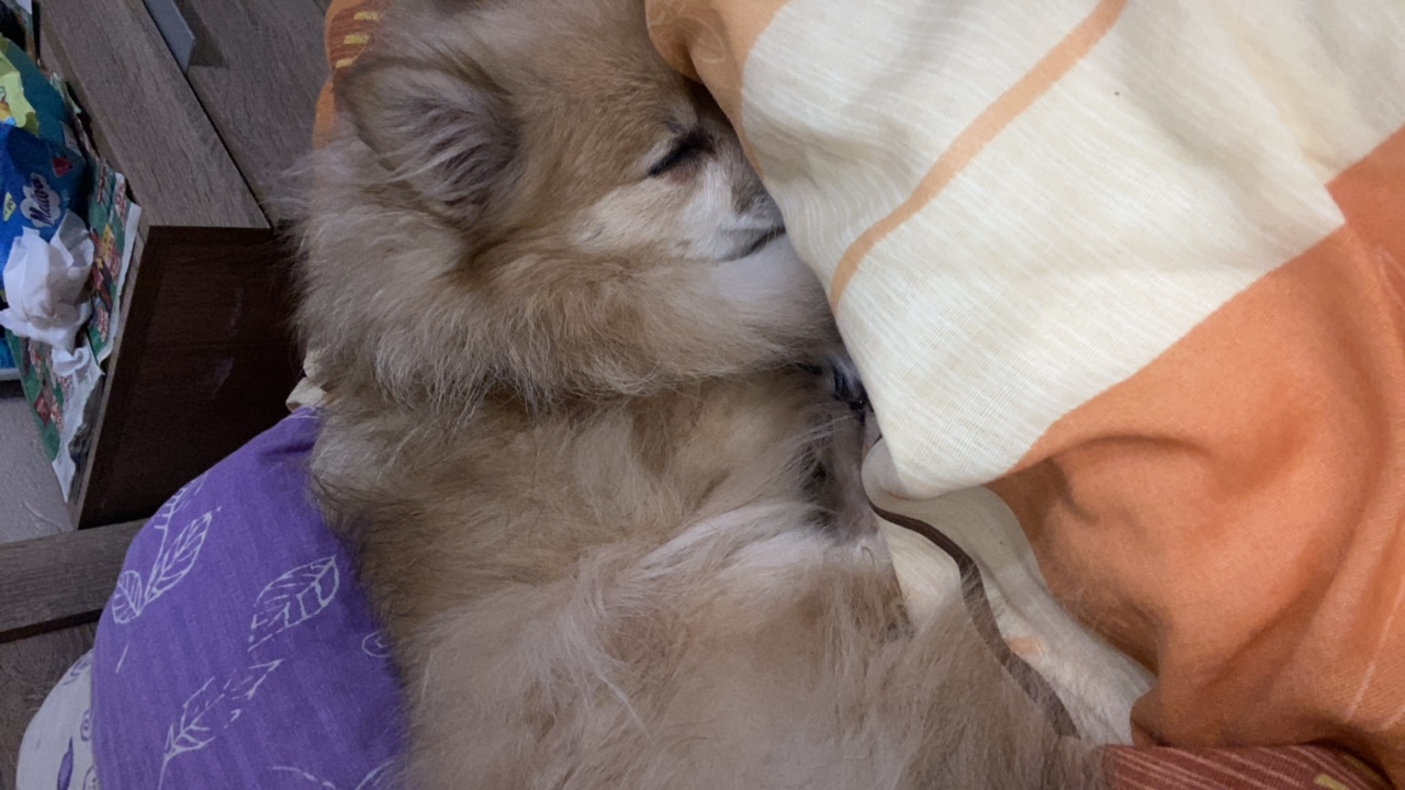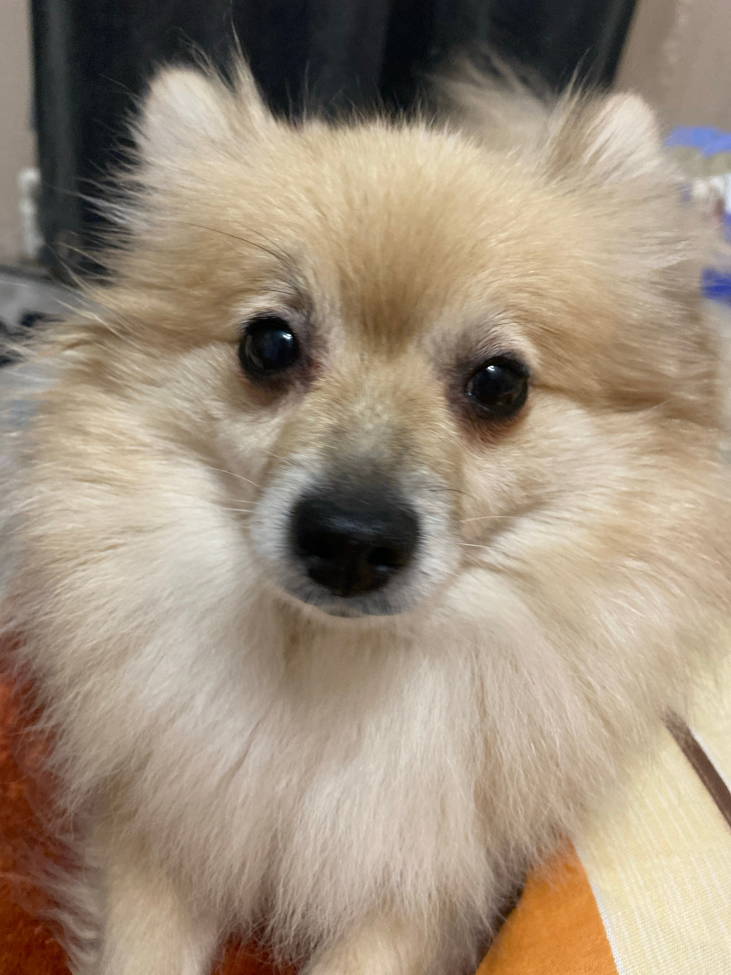 A close-up, slightly angled portrait shows a Pomeranian-type dog with light beige fur. The dog has small, dark eyes and a black nose. The background includes dark, blurred areas and a corner of a stri…read more