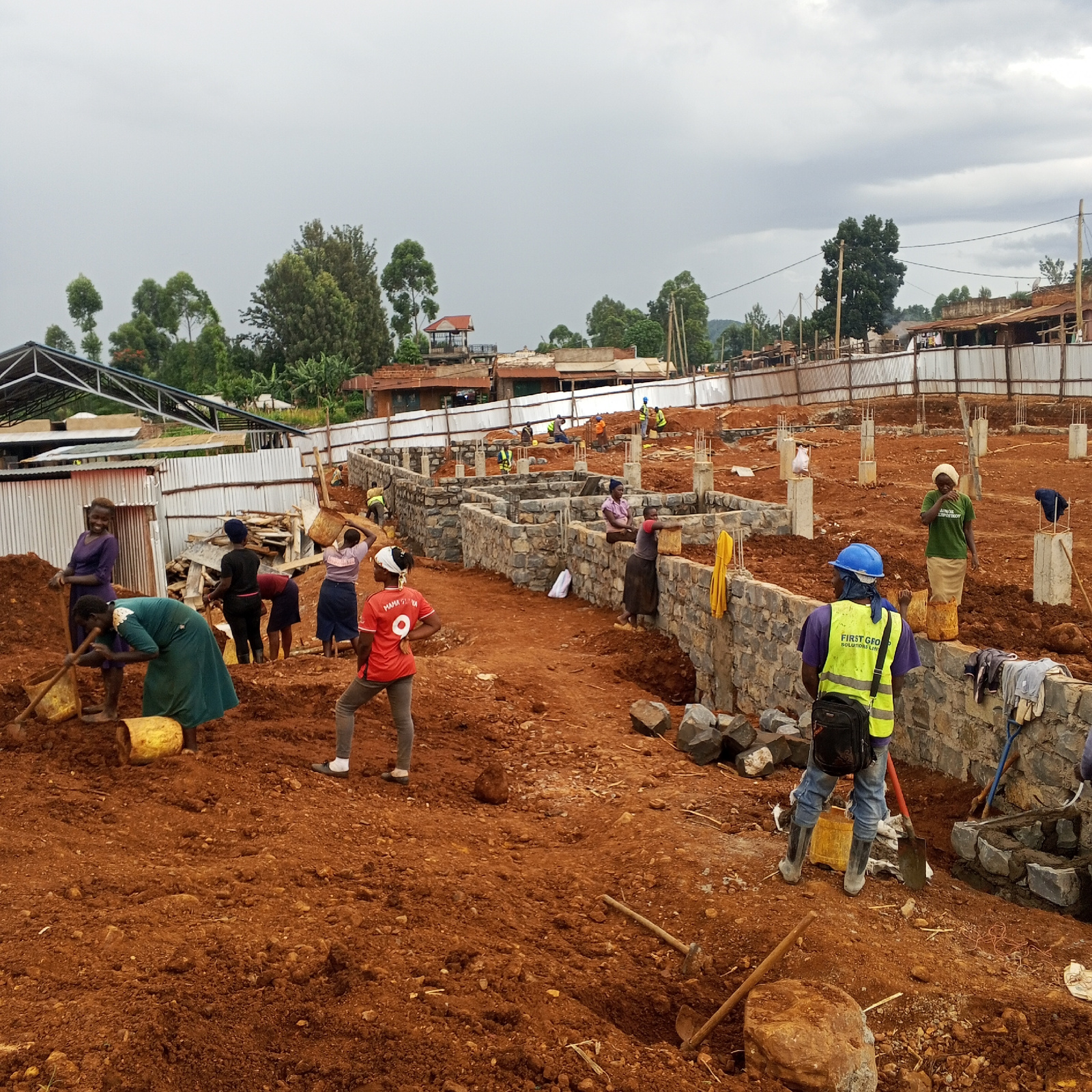 The image depicts a bustling construction site in Borabu Chitago ward, Kenya, under an overcast sky. The ground is characterized by rich, reddish-brown soil, indicating ongoing excavation and earth-mo…read more