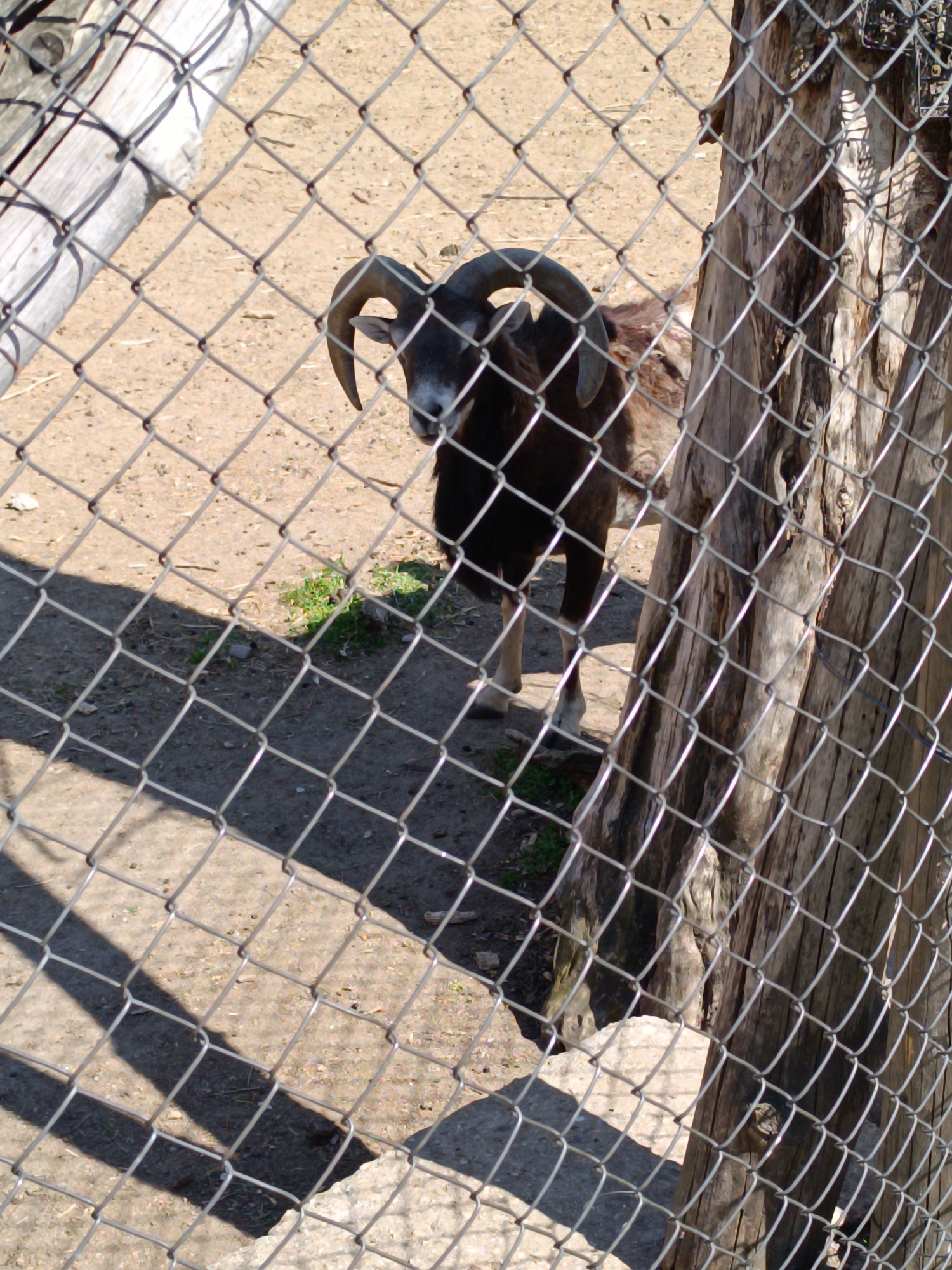 A dark brown mouflon with large, curved horns stands within an enclosure made of chain-link fencing. The animal is in a zoo, judging by the fence. The ground within the enclosure is mostly bare dirt,…read more